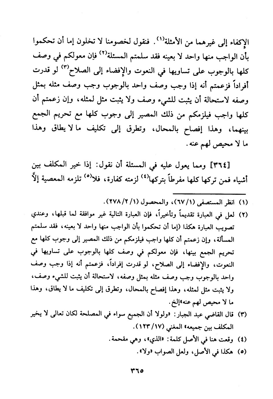 الإكفاء إِلَى غَيرهمَا من الْأَمْثِلَة. فَنَقُول لخصومنا لَا تخلون إِمَّا أَن تحكموا بِأَن الْوَاجِب مِنْهَا وَاحِد لَا بِعَيْنِه فقد سلمتم المسئلة فَإِن معولكم فِي وصف كلهَا بِالْوُجُوب على تساويها فِي النعوت والإفضاء إِلَى الصّلاح لَو قدرت أفرادا فزعمتم أَنه إِذا وَجب وصف وَاحِد بِالْوُجُوب وَجب وصف مثله بِمثل وَصفه لَا ستحالة أَن يثبت للشَّيْء وصف وَلَا يثبت مثل لمثله، وَإِن زعمتم أَن كلهَا وَاجِب فيلزمكم من ذَلِك الْمصير إِلَى وجوب كلهَا مَعَ تَحْرِيم الْجمع بَينهمَا، وَهَذَا إفصاح بالمحال، وتطرق إِلَى تَكْلِيف مَا لَا يُطَاق وَهَذَا مَا لَا محيص لَهُم عَنهُ.
