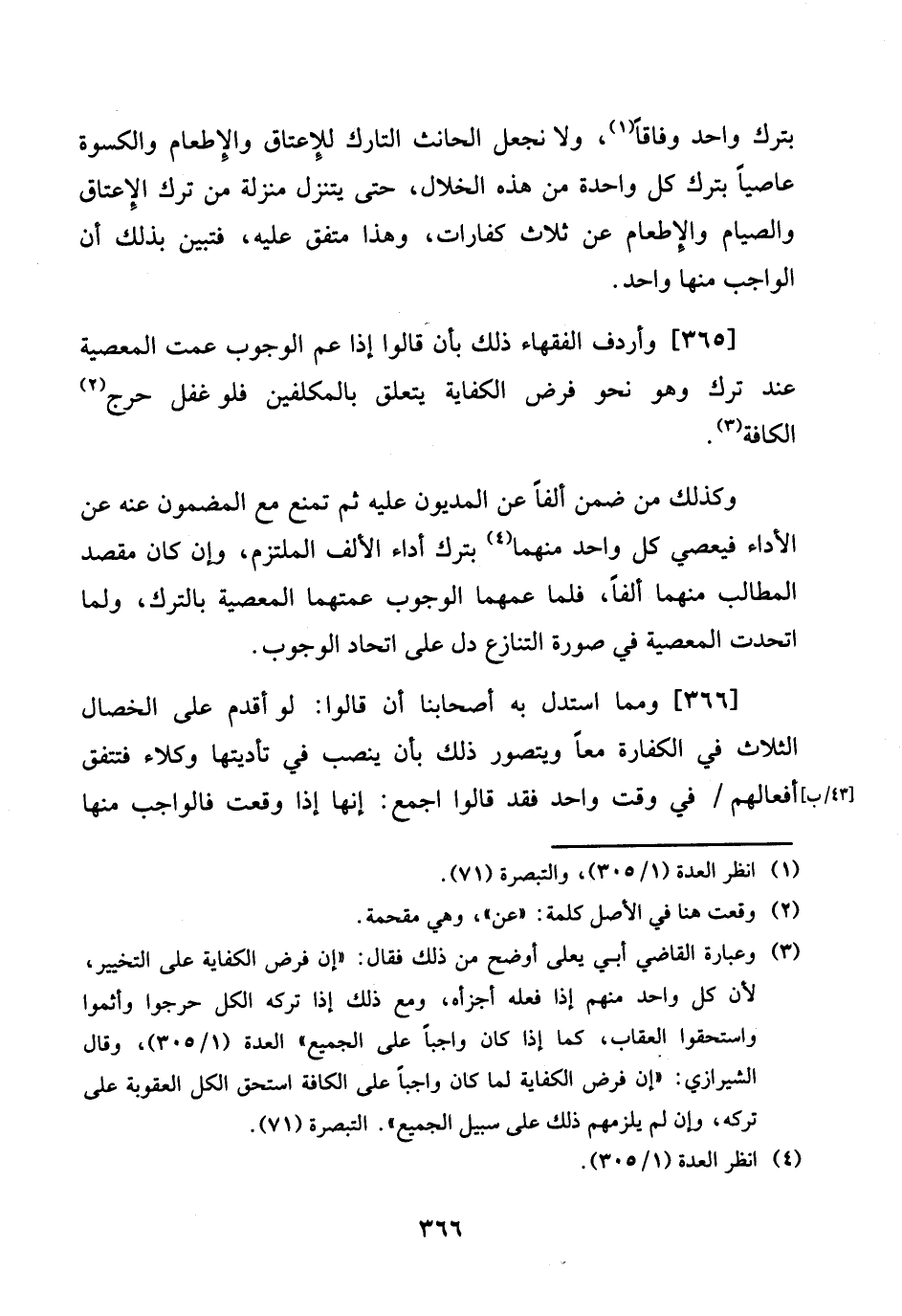 [365] وَأَرْدَفَ الْفُقَهَاء ذَلِك بِأَن قَالُوا إِذا عَم الْوُجُوب عَمت الْمعْصِيَة عِنْد ترك وَهُوَ نَحْو فرض الْكِفَايَة يتَعَلَّق بالمكلفين فَلَو غفل حرج الكافة.