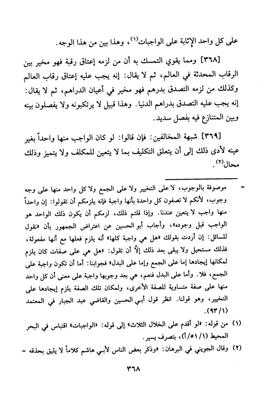 [368] وَمِمَّا يُقَوي التَّمَسُّك بِهِ أَن من لزمَه إِعْتَاق رَقَبَة فَهُوَ مُخَيّر بَين الرّقاب المحدثة فِي الْعَالم، ثمَّ لَا يُقَال: إِنَّه يجب عَلَيْهِ إِعْتَاق رِقَاب الْعَالم وَكَذَلِكَ من لزمَه التَّصَدُّق بدرهم فَهُوَ مُخَيّر فِي أَعْيَان الدَّرَاهِم، ثمَّ لَا يُقَال: إِنَّه يجب عَلَيْهِ التَّصَدُّق بِدَرَاهِم الدُّنْيَا. وَهَذَا قبيل لَا يرتكبونه وَلَا يفصلون بَينه وَبَين الْمُتَنَازع فِيهِ بفصل سديد.