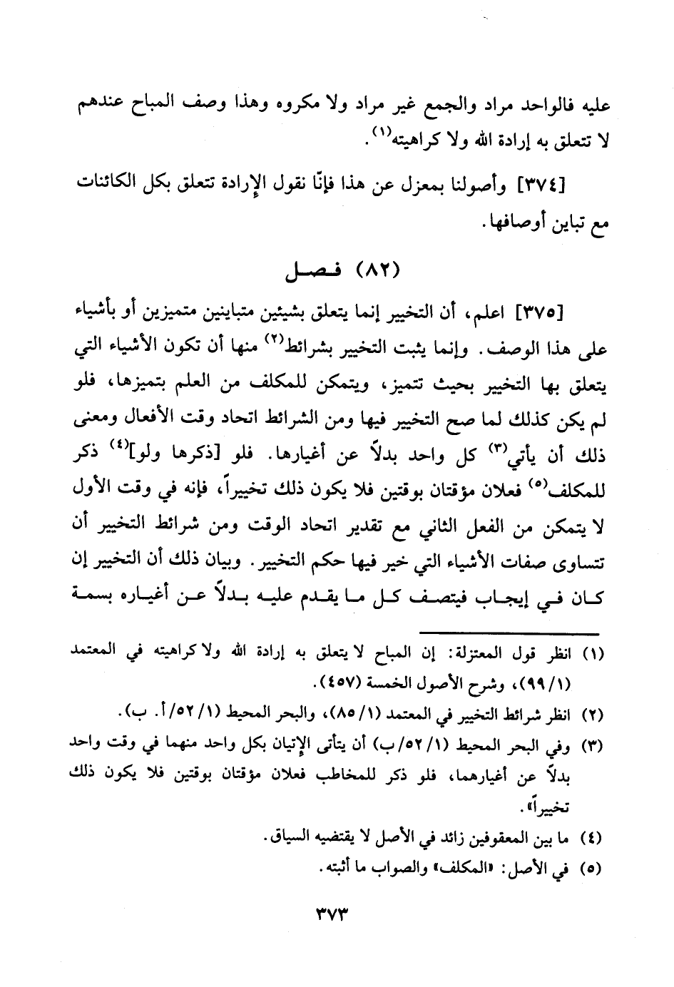 [375] اعْلَم، أَن التَّخْيِير إِنَّمَا يتَعَلَّق بشيئين متباينين متميزين أَو بأَشْيَاء على هَذَا الْوَصْف. وَإِنَّمَا يثبت التَّخْيِير بشرائط مِنْهَا أَن تكون الأِشياء الَّتِي يتَعَلَّق بهَا التَّخْيِير بِحَيْثُ تتَمَيَّز، ويتمكن للمكلف من الْعلم بتميزها، فَلَو لم يكن كَذَلِك لما صَحَّ التَّخْيِير فِيهَا وَمن الشَّرَائِط اتِّحَاد وَقت الْأَفْعَال وَمعنى ذَلِك أَن يَأْتِي كل وَاحِد بَدَلا عَن أغيارها. فَلَو [ذكرهَا وَلَو] ذكر للمكلف فعلان مؤقتان بوقتين فَلَا يكون ذَلِك تخييرا، فَإِنَّهُ فِي وَقت الأول لَا يتَمَكَّن من الْفِعْل الثَّانِي مَعَ تَقْدِير اتِّحَاد الْوَقْت وَمن شَرَائِط التَّخْيِير أَن تتساوى صِفَات الْأَشْيَاء الَّتِي خير فِيهَا حكم التَّخْيِير. وَبَيَان ذَلِك أَن التَّخْيِير إِن كَانَ فِي إِيجَاب فيتصف كل مَا يقدم عَلَيْهِ بَدَلا عَن أغياره بسمة