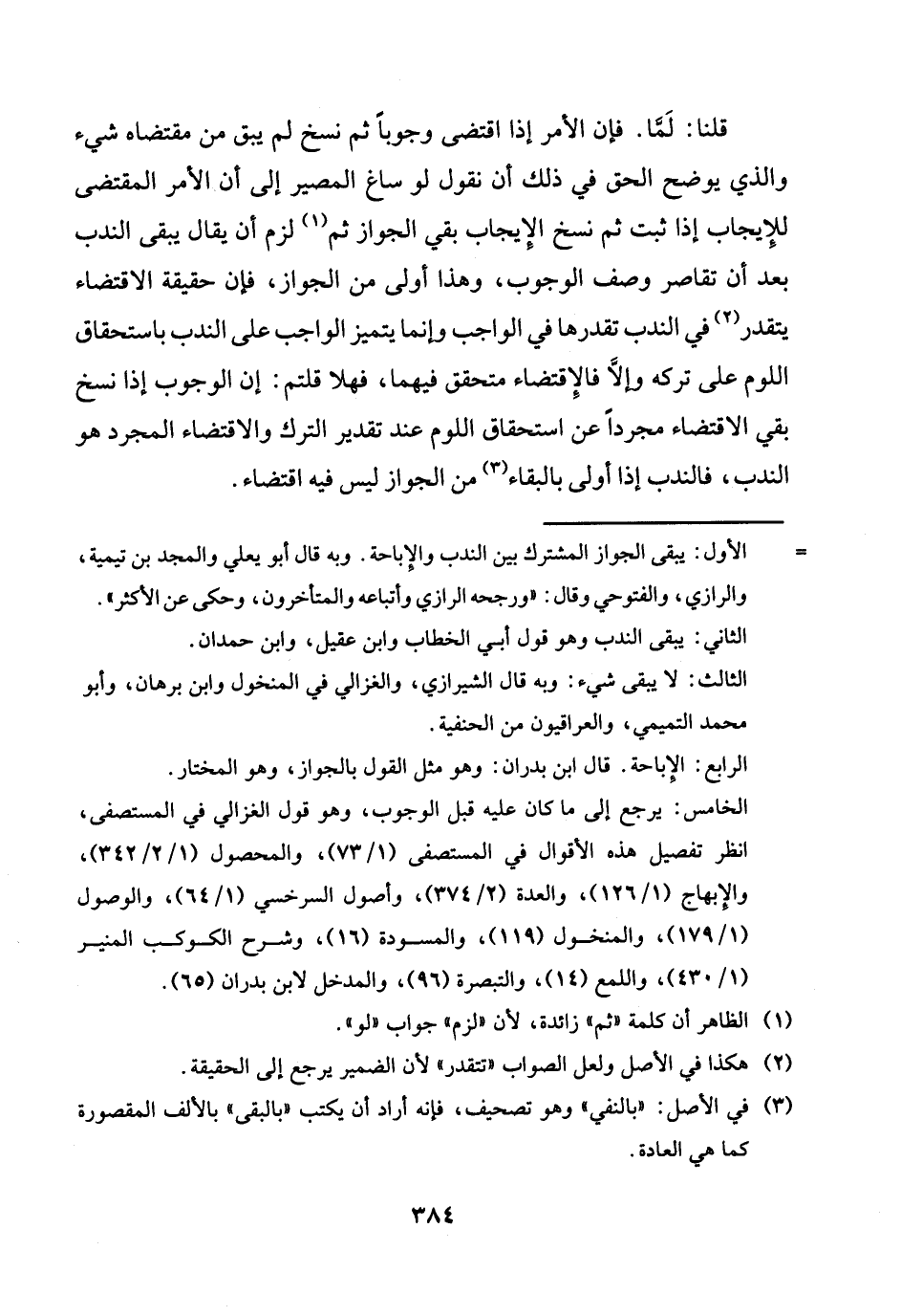 قُلْنَا: لما. فَإِن الْأَمر إِذا اقْتضى وجوبا ثمَّ نسخ لم يبْق من مُقْتَضَاهُ شَيْء وَالَّذِي يُوضح الْحق فِي ذَلِك أَن نقُول لَو سَاغَ الْمصير إِلَى أَن الْأَمر الْمُقْتَضى للْإِيجَاب إِذا ثَبت ثمَّ نسخ الْإِيجَاب بَقِي الْجَوَاز ثمَّ لزم أَن يُقَال يبْقى النّدب بعد أَن تقاصر وصف الْوُجُوب، وَهَذَا أولى من الْجَوَاز، فَإِن حَقِيقَة الِاقْتِضَاء يتَقَدَّر فِي النّدب تقدرها فِي الْوَاجِب وَإِنَّمَا يتَمَيَّز الْوَاجِب على النّدب بِاسْتِحْقَاق اللوم على تَركه وَإِلَّا فالإقتضاء مُتَحَقق فيهمَا، فَهَلا قُلْتُمْ: إِن الْوُجُوب إِذا نسخ بَقِي الِاقْتِضَاء مُجَردا عَن اسْتِحْقَاق اللوم عِنْد تَقْدِير التّرْك والاقتضاء الْمُجَرّد هُوَ النّدب، فالندب إِذا أولى بِالْبَقَاءِ من الْجَوَاز لَيْسَ فِيهِ اقْتِضَاء.