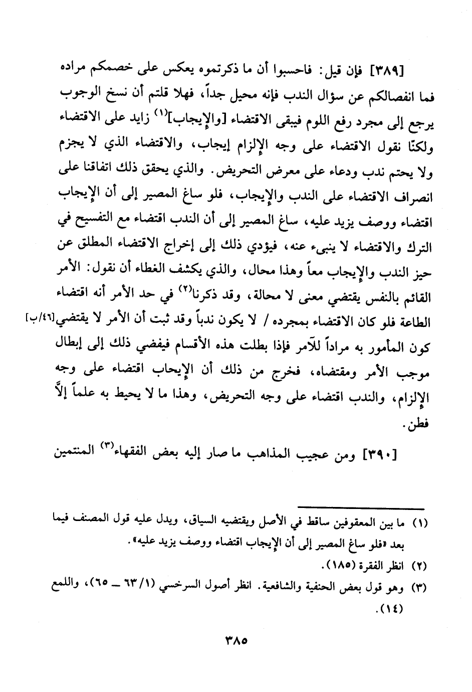 [389] فَإِن قيل: فاحسبوا أَن مَا ذكرتموه يعكس على خصمكم مُرَاده فَمَا انفصالكم عَن سُؤال النّدب فَإِنَّهُ محيل جدا، فَهَلا قُلْتُمْ أَن نسخ الْوُجُوب يرجع إِلَى مُجَرّد رفع اللوم فَيبقى الِاقْتِضَاء [والإيجاب] زايد على الِاقْتِضَاء وَلَكنَّا نقُول الِاقْتِضَاء على وَجه الْإِلْزَام إِيجَاب، والاقتضاء الَّذِي لَا يجْزم وَلَا يحتم ندب وَدُعَاء على معرض التحريض. وَالَّذِي يُحَقّق ذَلِك اتفاقنا على انصراف الِاقْتِضَاء على النّدب والإيجاب، فَلَو سَاغَ الْمصير إِلَى أَن الْإِيجَاب اقْتِضَاء وَوصف يزِيد عَلَيْهِ، سَاغَ الْمصير إِلَى أَن النّدب اقْتِضَاء مَعَ التفسيح فِي التّرْك والاقتضاء لَا يُنبئ عَنهُ، فيؤدى ذَلِك إِلَى إِخْرَاج الِاقْتِضَاء الْمُطلق عَن حيّز النّدب والإيجاب مَعًا وَهَذَا محَال، وَالَّذِي يكْشف الغطاء أَن نقُول: أَن الْأَمر الْقَائِم بِالنَّفسِ يَقْتَضِي معنى لَا محَالة، وَقد ذكرنَا فِي حد الْأَمر أَنه اقْتِضَاء الطَّاعَة فَلَو كَانَ الِاقْتِضَاء بِمُجَرَّدِهِ / لَا يكون ندبا وَقد ثَبت أَن الْأَمر لَا يَقْتَضِي [46 / ب] كَون الْمَأْمُور بِهِ مرَادا للْآمِر فَإِذا بطلت هَذِه الْأَقْسَام فيفضي ذَلِك إِلَى إبِْطَال مُوجب الْأَمر وَمُقْتَضَاهُ، فَخرج من ذَلِك أَن الإيحاب اقْتِضَاء على وَجه الْإِلْزَام، وَالنَّدْب اقْتِضَاء على وَجه التحريض، وَهَذَا مَا لَا يُحِيط بِهِ علما إِلَّا فطن.
