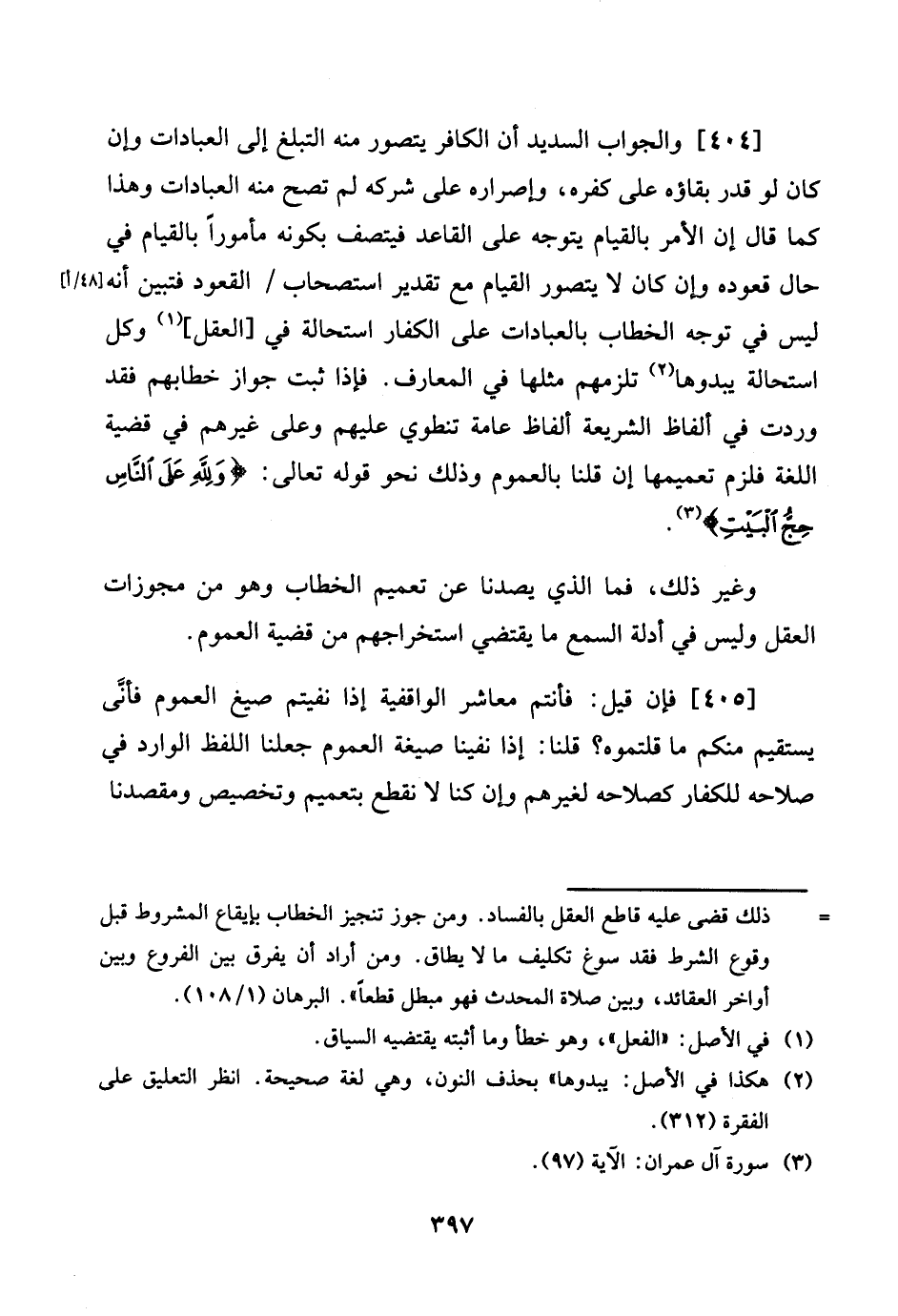 [404] وَالْجَوَاب السديد أَن الْكَافِر يتَصَوَّر مِنْهُ التبلغ إِلَى الْعِبَادَات وَإِن كَانَ لَو قدر بَقَاؤُهُ على كفره، وإصراره على شركه لم تصح مِنْهُ الْعِبَادَات وَهَذَا كَمَا قَالَ إِن الْأَمر بِالْقيامِ يتَوَجَّه على الْقَاعِد فيتصف بِكَوْنِهِ مَأْمُورا بِالْقيامِ فِي حَال قعوده وَإِن كَانَ لَا يتَصَوَّر الْقيام مَعَ تَقْدِير اسْتِصْحَاب / الْقعُود فَتبين أَنه [48 / أ] لَيْسَ فِي توجه الْخطاب بالعبادات على الْكفَّار اسْتِحَالَة فِي [الْعقل] وكل اسْتِحَالَة يبدوها تلزمهم مثلهَا فِي المعارف. فَإِذا ثَبت جَوَاز خطابهم فقد وَردت فِي أَلْفَاظ الشَّرِيعَة أَلْفَاظ عَامَّة تنطوي عَلَيْهِم وعَلى غَيرهم فِي قَضِيَّة اللُّغَة فَلَزِمَ تعميمها إِن قُلْنَا بِالْعُمُومِ وَذَلِكَ نَحْو قَوْله تَعَالَى: {وَللَّه على النَّاس حج الْبَيْت} .