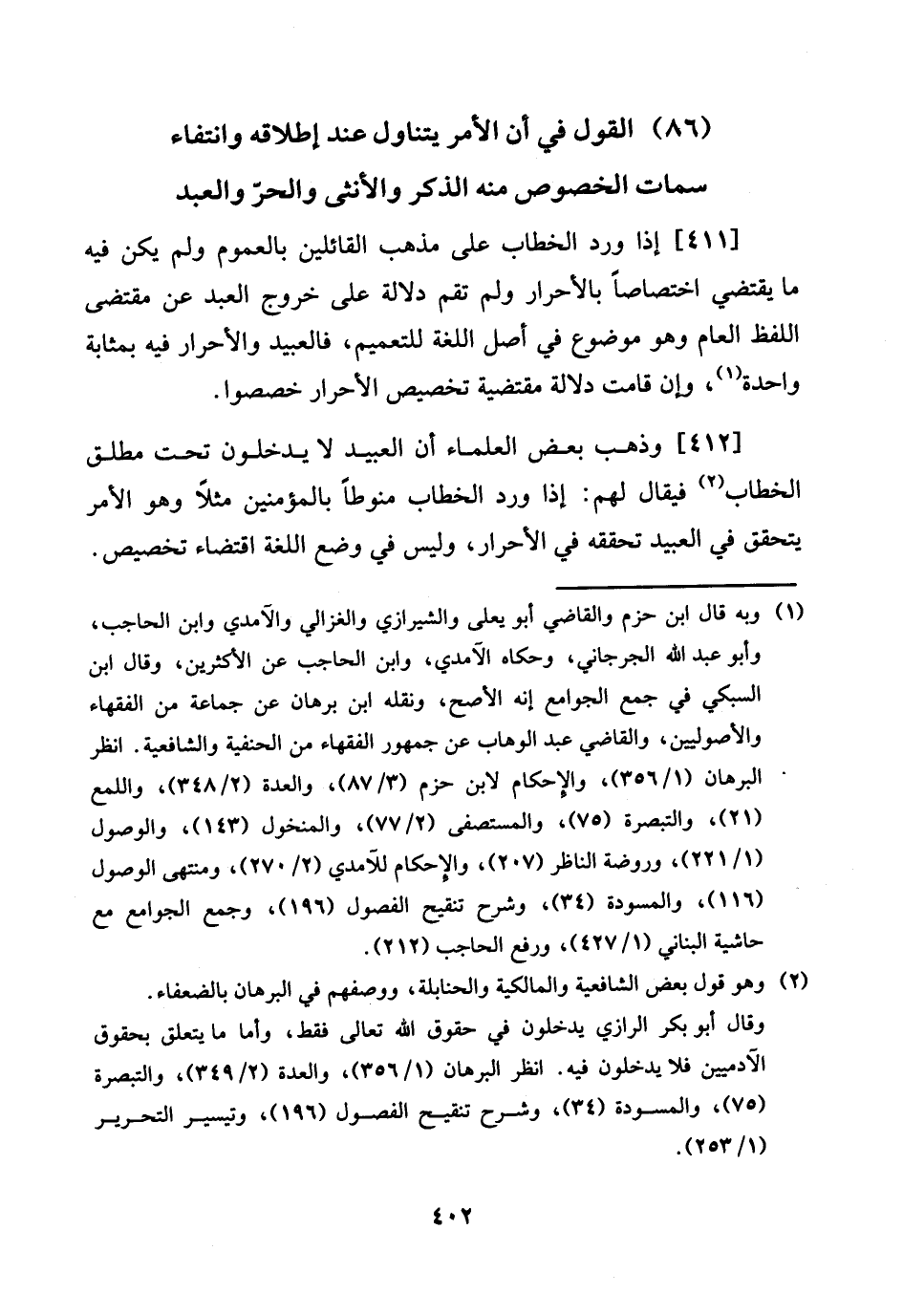 [411] إِذا ورد الْخطاب على مَذْهَب الْقَائِلين بِالْعُمُومِ وَلم يكن فِيهِ مَا يَقْتَضِي اختصاصا بالأحرار وَلم تقم دلَالَة على خُرُوج العَبْد عَن مُقْتَضى اللَّفْظ الْعَام وَهُوَ مَوْضُوع فِي أصل اللُّغَة للتعميم، فالعبيد والأحرار فِيهِ بِمَثَابَة وَاحِدَة، وَإِن قَامَت دلَالَة مقتضية تَخْصِيص الْأَحْرَار خصصوا.