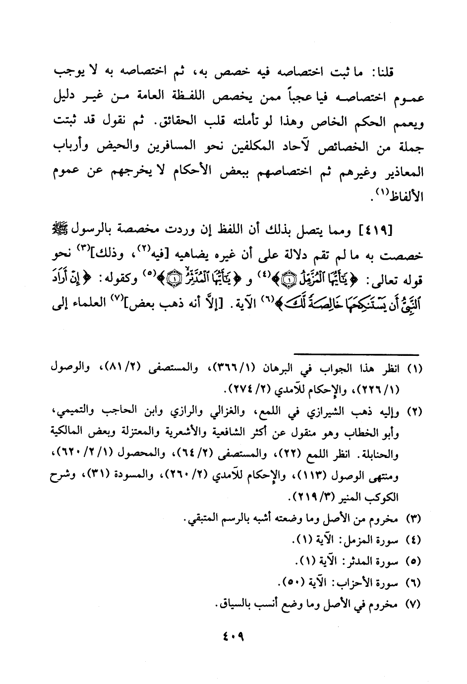 [419] وَمِمَّا يتَّصل بذلك أَن اللَّفْظ إِن وَردت مخصصة بالرسول [صلى الله عَلَيْهِ وَسلم] خصصت بِهِ مَا لم تقم دلَالَة على أَن غَيره يضاهيه [فِيهِ، وَذَلِكَ] نَحْو