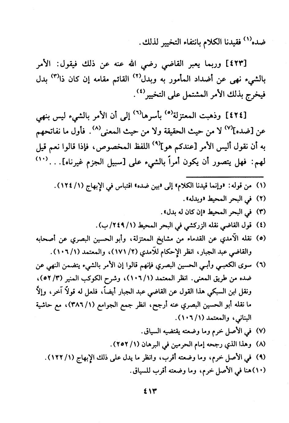 [423] وَرُبمَا يعبر القَاضِي رَضِي الله عَنهُ عَن ذَلِك فَيَقُول: الْأَمر بالشَّيْء نهى عَن أضداد الْمَأْمُور بِهِ وَبدل الْقَائِم مقَامه إِن كَانَ ذَا بدل فَيخرج بذلك الْأَمر الْمُشْتَمل على التَّخْيِير.
