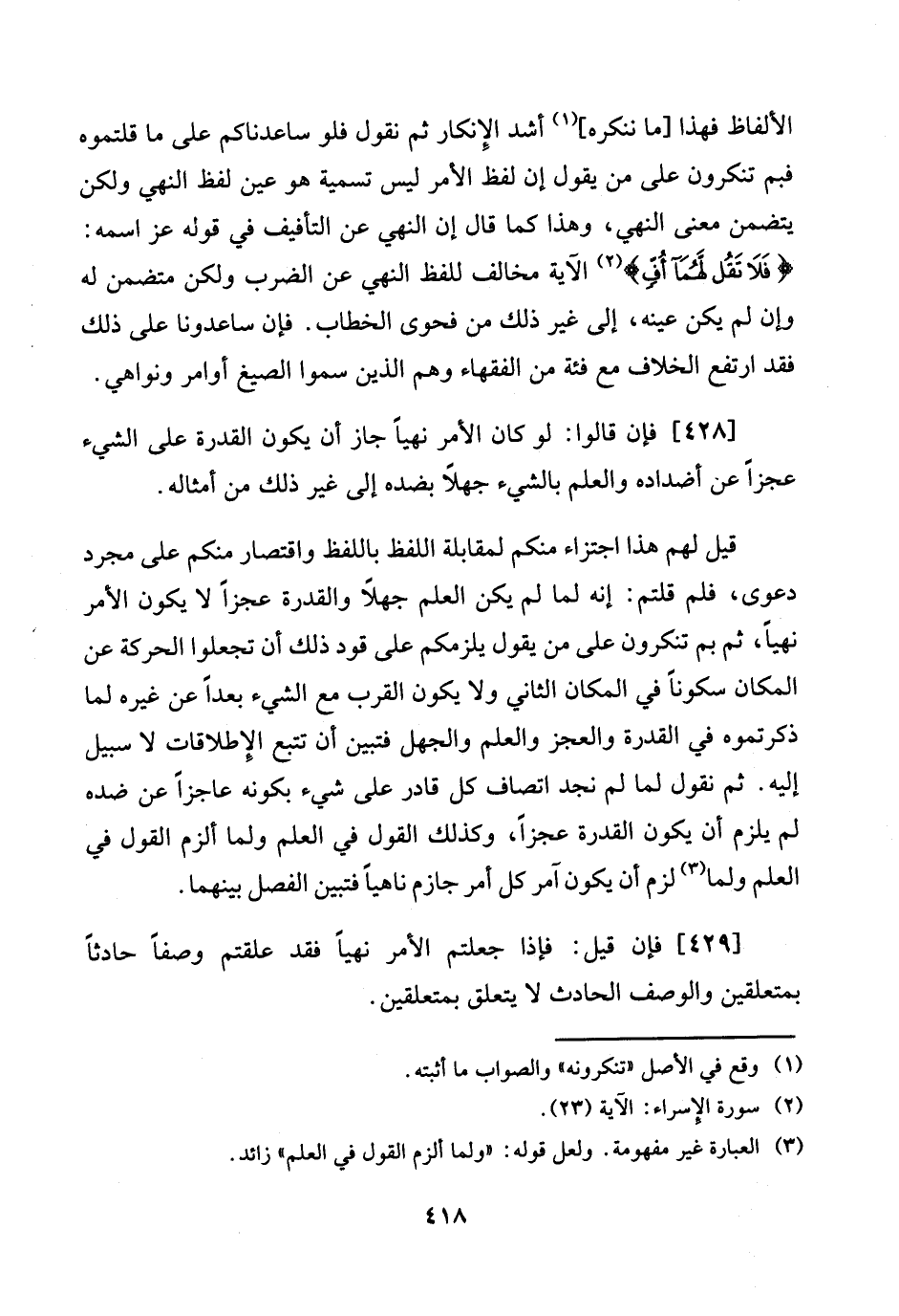 [428] فَإِن قَالُوا: لَو كَانَ الْأَمر نهيا جَازَ أَن يكون الْقُدْرَة على الشَّيْء عَجزا عَن أضداده وَالْعلم بالشَّيْء جهلا بضده إِلَى غير ذَلِك من أَمْثَاله.