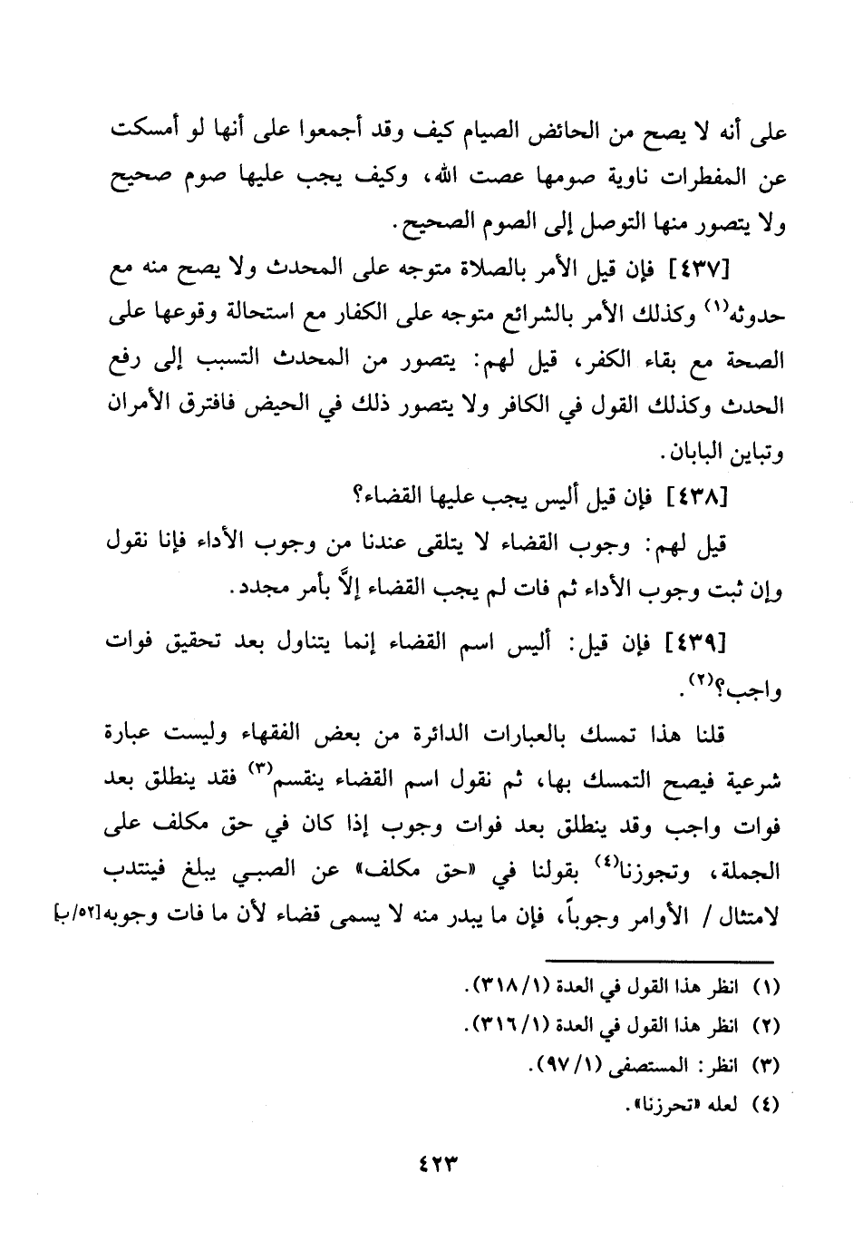[437] فَإِن قيل الْأَمر بِالصَّلَاةِ مُتَوَجّه على الْمُحدث وَلَا يَصح مِنْهُ مَعَ حُدُوثه وَكَذَلِكَ الْأَمر بالشرائع مُتَوَجّه على الْكفَّار مَعَ اسْتِحَالَة وُقُوعهَا على الصِّحَّة مَعَ بَقَاء الْكفْر، قيل لَهُم: يتَصَوَّر من الْمُحدث التَّسَبُّب إِلَى رفع الْحَدث وَكَذَلِكَ القَوْل فِي الْكَافِر وَلَا يتَصَوَّر ذَلِك فِي الْحيض فافترق الْأَمْرَانِ وتباين البابان.