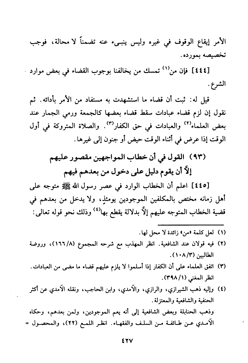 [445] اعْلَم أَن الْخطاب الْوَارِد فِي عصر رَسُول الله [صلى الله عَلَيْهِ وَسلم] مُتَوَجّه على أهل زَمَانه مُخْتَصّ بالمكلفين الْمَوْجُودين يَوْمئِذٍ، وَلَا يدْخل من بعدهمْ فِي قَضِيَّة الْخطاب المتوجه عَلَيْهِم إِلَّا بِدلَالَة يقطع بهَا وَذَلِكَ نَحْو قَوْله تَعَالَى: