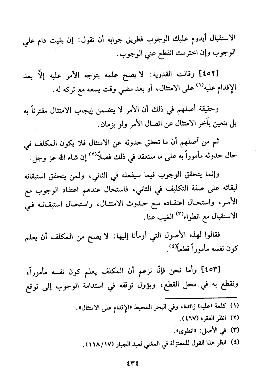 [453] وَأما نَحن فَإنَّا نزعم أَن الْمُكَلف يعلم كَون نَفسه مَأْمُورا، ونقطع بِهِ فِي مَحل الْقطع، ويؤول توقفه فِي اسْتِدَامَة الْوُجُوب إِلَى توقع