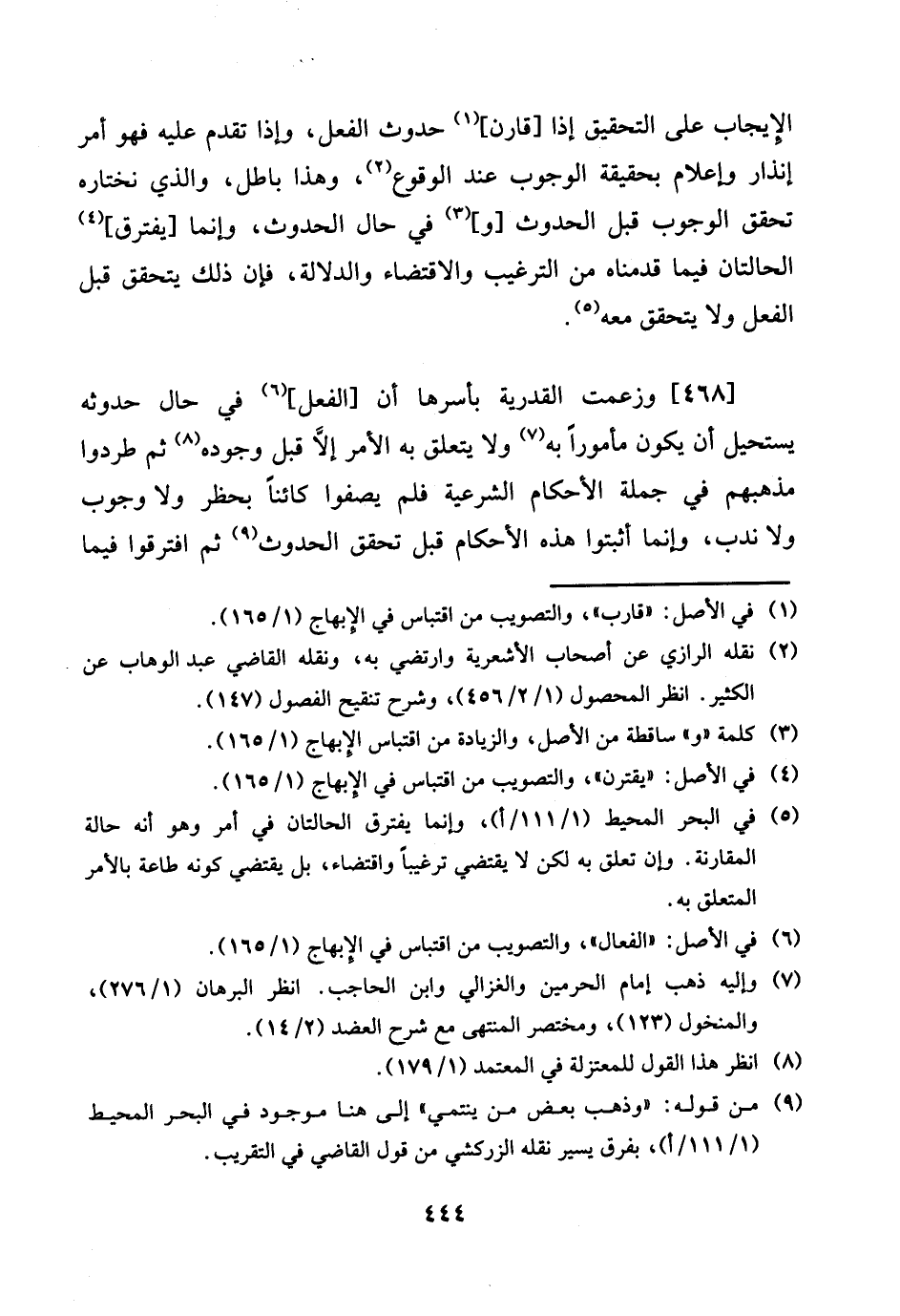 [468] وَزَعَمت الْقَدَرِيَّة بأسرها أَن [الْفِعْل] فِي حَال حُدُوثه يَسْتَحِيل أَن يكون مَأْمُورا بِهِ وَلَا يتَعَلَّق بِهِ الْأَمر إِلَّا قبل وجوده ثمَّ طردوا مَذْهَبهم فِي جملَة الْأَحْكَام الشَّرْعِيَّة فَلم يصفوا كَائِنا بحظر وَلَا وجوب وَلَا ندب، وَإِنَّمَا أثبتوا هَذِه الْأَحْكَام قبل تحقق الْحُدُوث ثمَّ افْتَرَقُوا فِيمَا
