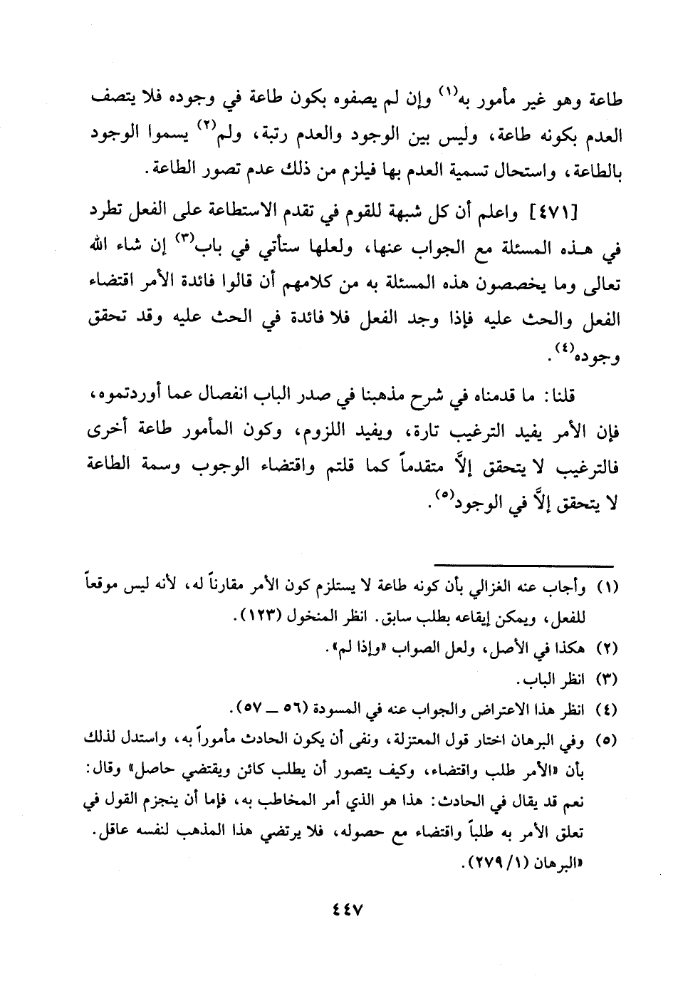 [471] وَاعْلَم ان كل شُبْهَة للْقَوْم فِي تقدم الِاسْتِطَاعَة على الْفِعْل تطرد فِي هَذِه المسئلة مَعَ الْجَواب عَنْهَا، ولعلها ستأتي فِي بَاب إِن شَاءَ الله تَعَالَى وَمَا يخصصون هَذِه المسئلة بِهِ من كَلَامهم أَن قَالُوا فَائِدَة الْأَمر اقْتِضَاء الْفِعْل والحث عَلَيْهِ فَإِذا وجد الْفِعْل فَلَا فَائِدَة فِي الْحَث عَلَيْهِ وَقد تحقق وجوده.