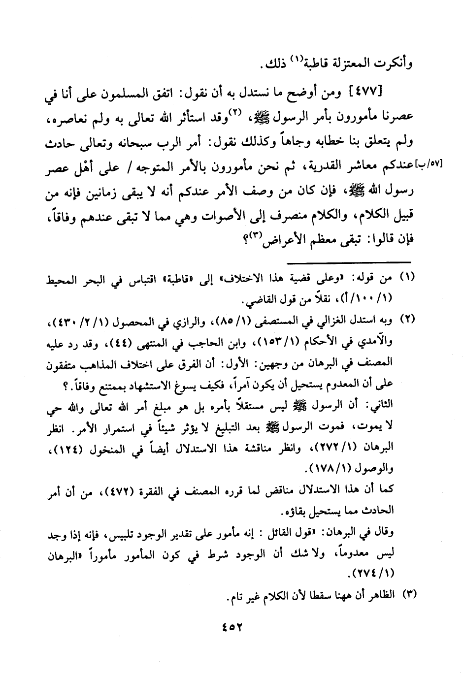 [477] وَمن أوضح مَا نستدل بِهِ أَن نقُول: اتّفق الْمُسلمُونَ على أَنا فِي عصرنا مأمورون بِأَمْر الرَّسُول [صلى الله عَلَيْهِ وَسلم] ، وَقد اسْتَأْثر الله تَعَالَى بِهِ وَلم نعاصره، وَلم يتَعَلَّق بِنَا خطابه وجاها وَكَذَلِكَ نقُول: أَمر الرب سُبْحَانَهُ وَتَعَالَى حَادث [57 / ب] عنْدكُمْ معاشر الْقَدَرِيَّة، ثمَّ نَحن مأمورون بِالْأَمر المتوجه / على أهل عصر رَسُول الله [صلى الله عَلَيْهِ وَسلم] ، فَإِن كَانَ من وصف الْأَمر عنْدكُمْ أَنه لَا يبْقى زمانين فَإِنَّهُ من قبيل الْكَلَام، وَالْكَلَام منصرف إِلَى الْأَصْوَات وَهِي مِمَّا لَا تبقى عِنْدهم وفَاقا، فَإِن قَالُوا: تبقى مُعظم الْأَعْرَاض؟