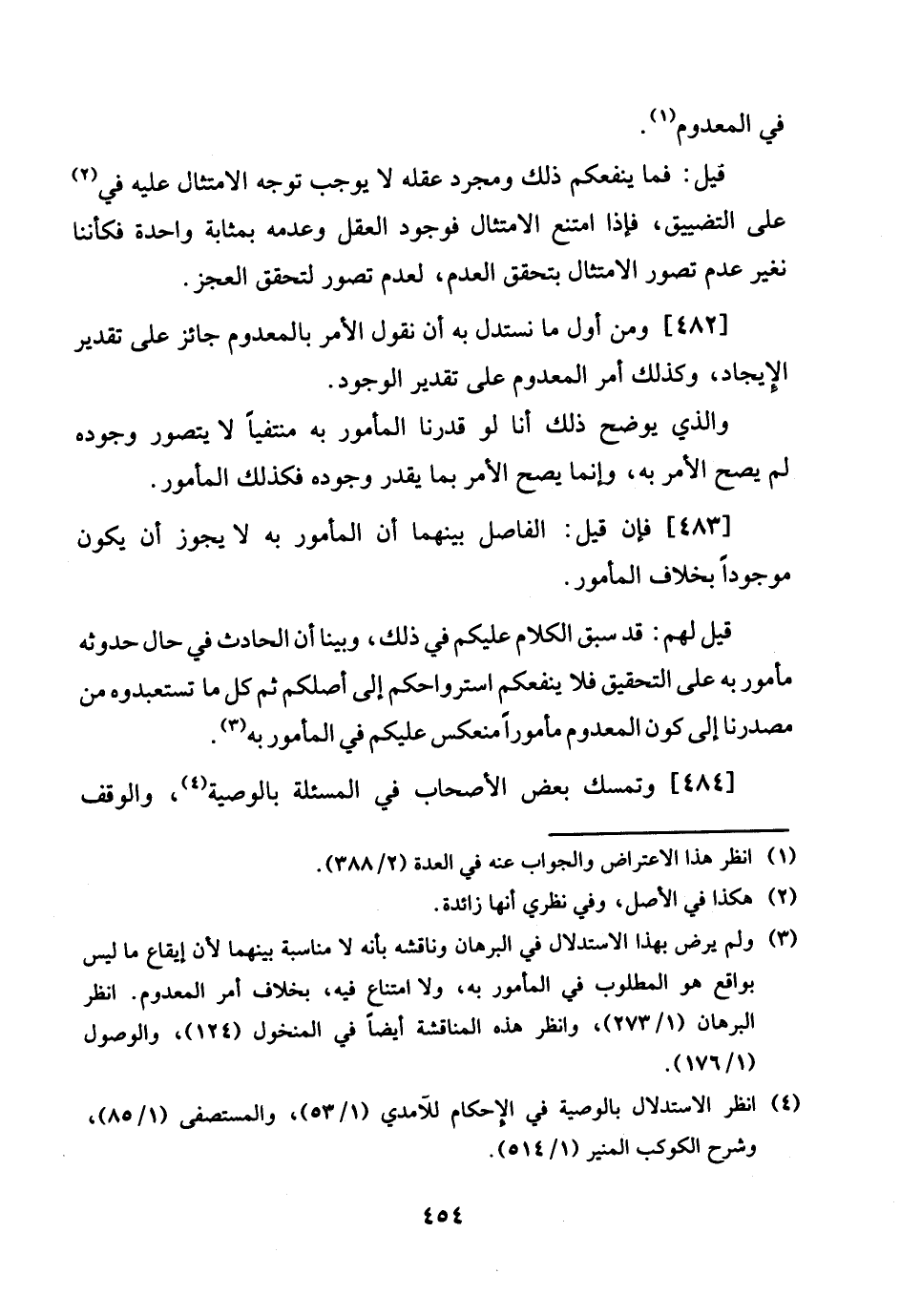 [482] وَمن أول مَا نستدل بِهِ أَن نقُول الْأَمر بالمعدوم جَائِز على تَقْدِير الإيجاد، وَكَذَلِكَ أَمر الْمَعْدُوم على تَقْدِير الْوُجُود.