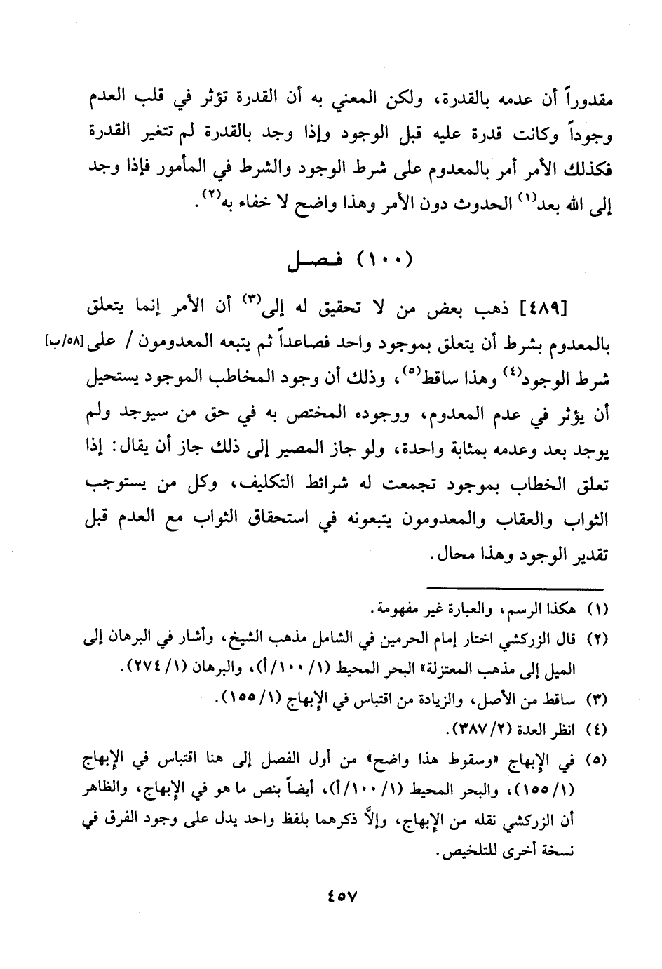 [489] ذهب بعض من لَا تَحْقِيق لَهُ إِلَى أَن الْأَمر إِنَّمَا يتَعَلَّق بالمعدوم بِشَرْط أَن يتَعَلَّق بموجود وَاحِد فَصَاعِدا ثمَّ يتبعهُ المعدومون / على [58 / ب] شَرط الْوُجُود وَهَذَا سَاقِط، وَذَلِكَ أَن وجود الْمُخَاطب الْمَوْجُود يَسْتَحِيل أَن يُؤثر فِي عدم الْمَعْدُوم، ووجوده الْمُخْتَص بِهِ فِي حق من سيوجد وَلم يُوجد بعد وَعَدَمه بِمَثَابَة وَاحِدَة، وَلَو جَازَ الْمصير إِلَى ذَلِك جَازَ أَن يُقَال: إِذا تعلق الْخطاب بموجود تجمعت لَهُ شَرَائِط التَّكْلِيف، وكل من يسْتَوْجب الثَّوَاب وَالْعِقَاب والمعدومون يتبعونه فِي اسْتِحْقَاق الثَّوَاب مَعَ الْعَدَم قبل تَقْدِير الْوُجُود وَهَذَا محَال.
