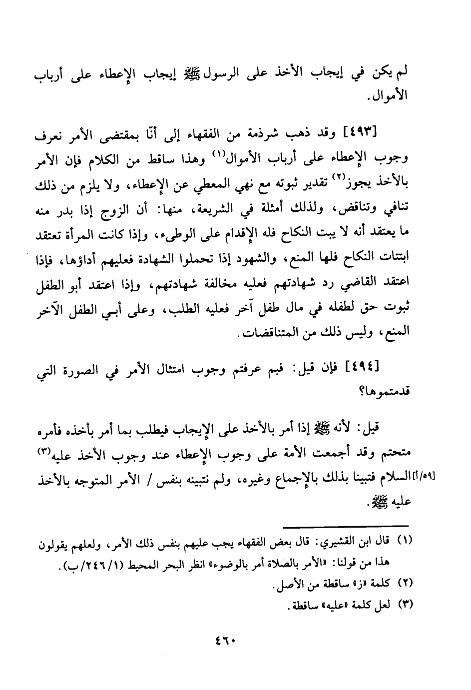 [493] وَقد ذهب شرذمة من الْفُقَهَاء إِلَى أَنا بِمُقْتَضى الْأَمر نَعْرِف وجوب الْإِعْطَاء على أَرْبَاب الْأَمْوَال وَهَذَا سَاقِط من الْكَلَام فَإِن الْأَمر بِالْأَخْذِ يجوز تَقْدِير ثُبُوته مَعَ نهي الْمُعْطِي عَن الْإِعْطَاء، وَلَا يلْزم من ذَلِك تنَافِي وتناقض، وَلذَلِك أَمْثِلَة فِي الشَّرِيعَة، مِنْهَا: أَن الزَّوْج إِذا بدر مِنْهُ مَا يعْتَقد أَنه لَا يبت النِّكَاح فَلهُ الْإِقْدَام على الوطئ، وَإِذا كَانَت الْمَرْأَة تعتقد ابتتات النِّكَاح فلهَا الْمَنْع، وَالشُّهُود إِذا تحملوا الشَّهَادَة فَعَلَيْهِم أَدَاؤُهَا، فَإِذا اعْتقد القَاضِي رد شَهَادَتهم فَعَلَيهِ مُخَالفَة شَهَادَتهم، وَإِذا اعْتقد أَبُو الطِّفْل ثُبُوت حق لطفله فِي مَال طِفْل آخر فَعَلَيهِ الطّلب، وعَلى أبي الطِّفْل الآخر الْمَنْع، وَلَيْسَ ذَلِك من المتناقضات.