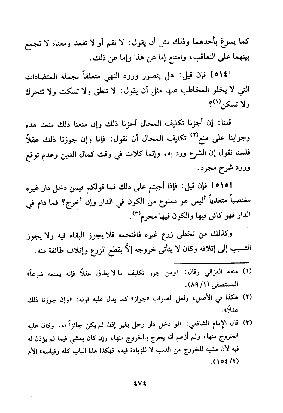 [514] فَإِن قيل: هَل يتَصَوَّر وُرُود النَّهْي مُتَعَلقا بجملة المتضادات الَّتِي لَا يَخْلُو الْمُخَاطب عَنْهَا مثل أَن يَقُول: لَا تنطق وَلَا تسكت وَلَا تتحرك وَلَا تسكن؟ .