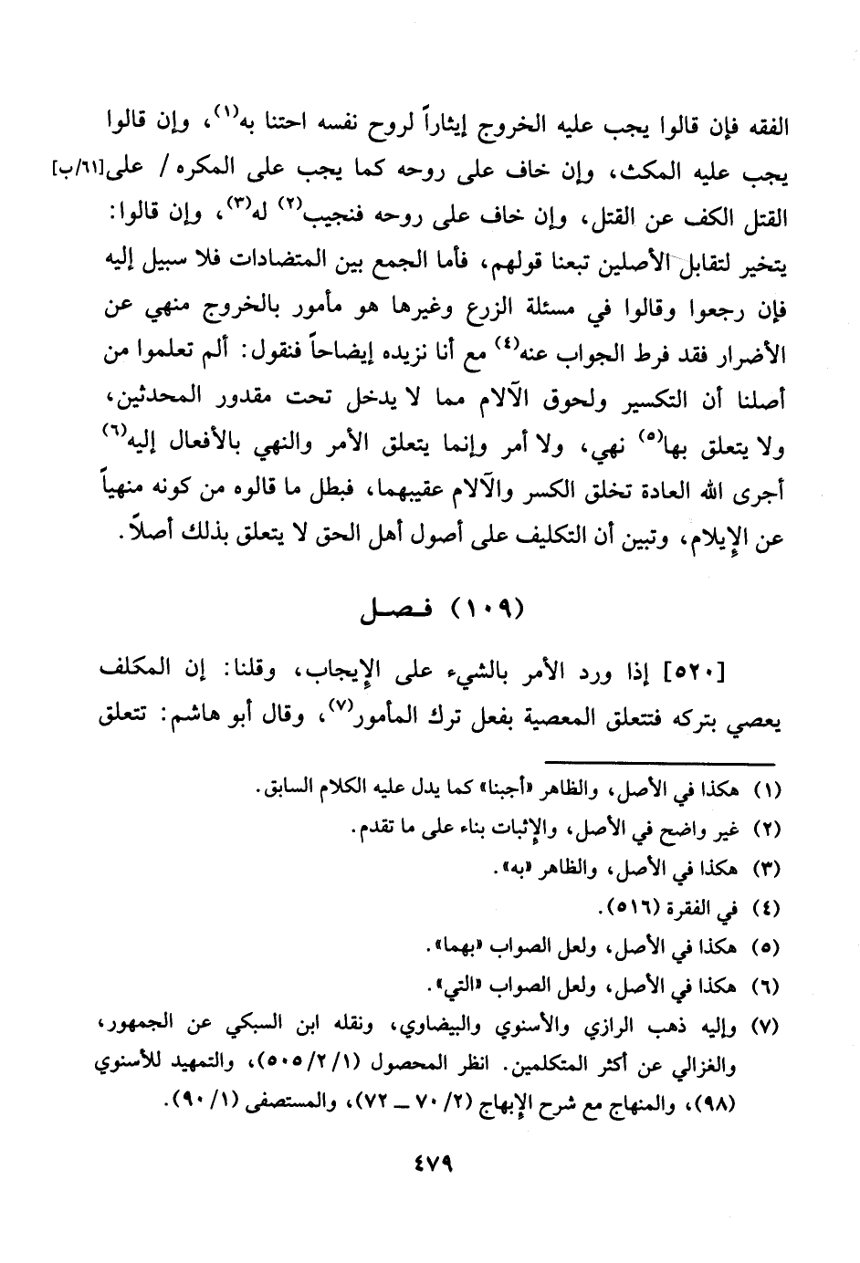 [520] إِذا ورد الْأَمر بالشَّيْء على الْإِيجَاب، وَقُلْنَا: إِن الْمُكَلف يَعْصِي بِتَرْكِهِ فتتعلق الْمعْصِيَة بِفعل ترك الْمَأْمُور، وَقَالَ أَبُو هَاشم: تتَعَلَّق
