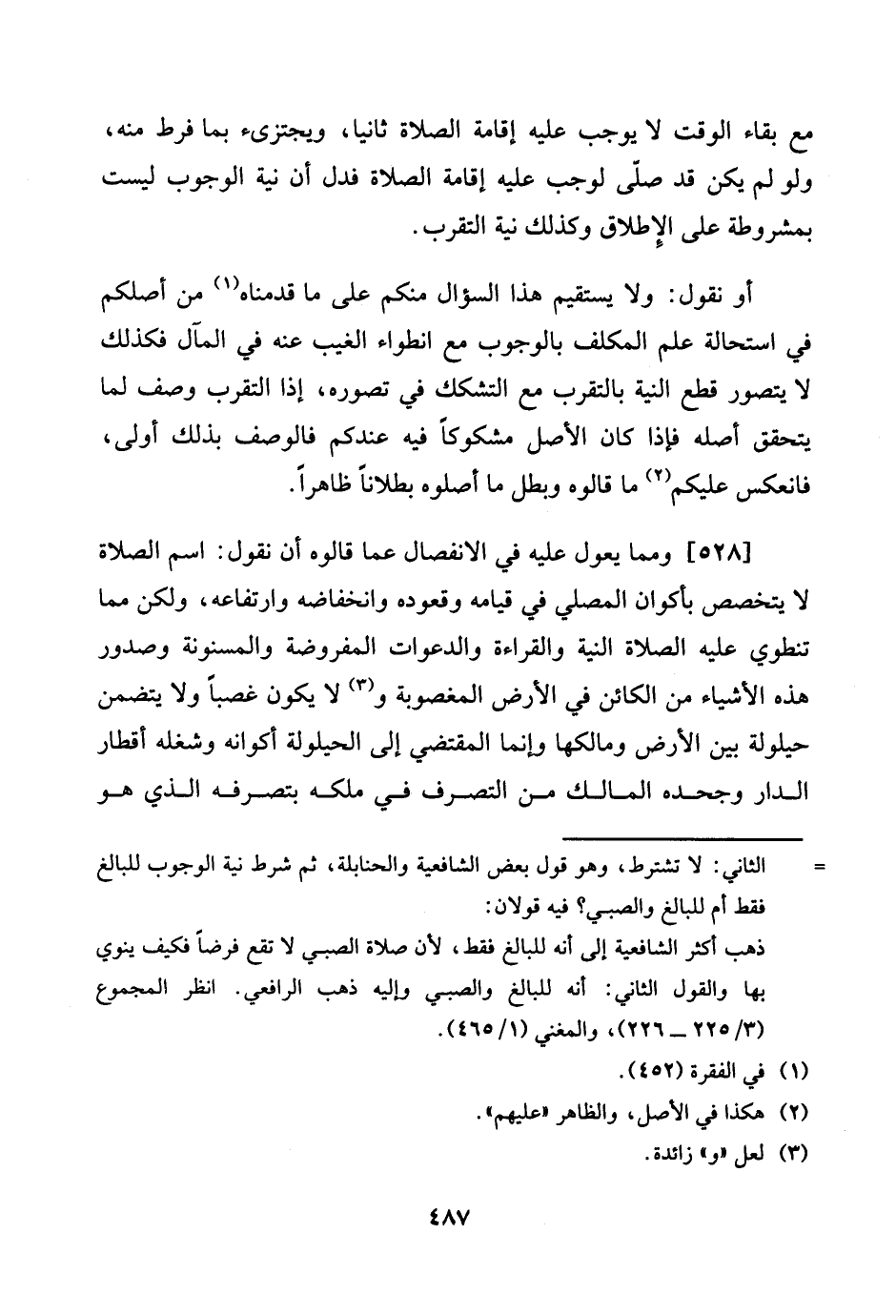 [528] وَمِمَّا يعول عَلَيْهِ فِي الِانْفِصَال عَمَّا قَالُوهُ أَن نقُول: اسْم الصَّلَاة لَا يتخصص بأكوان الْمُصَلِّي فِي قِيَامه وقعوده وانخفاضه وارتفاعه، وَلَكِن مِمَّا تنطوي عَلَيْهِ الصَّلَاة النِّيَّة وَالْقِرَاءَة والدعوات الْمَفْرُوضَة والمسنونة وصدور هَذِه الْأَشْيَاء من الْكَائِن فِي الأَرْض الْمَغْصُوبَة وَلَا يكون غصبا وَلَا يتَضَمَّن حيلولة بَين الأَرْض ومالكها وَإِنَّمَا الْمُقْتَضِي إِلَى الْحَيْلُولَة أكوانه وشغله أقطار الدَّار وجحده الْمَالِك من التَّصَرُّف فِي ملكه بتصرفه الَّذِي هُوَ