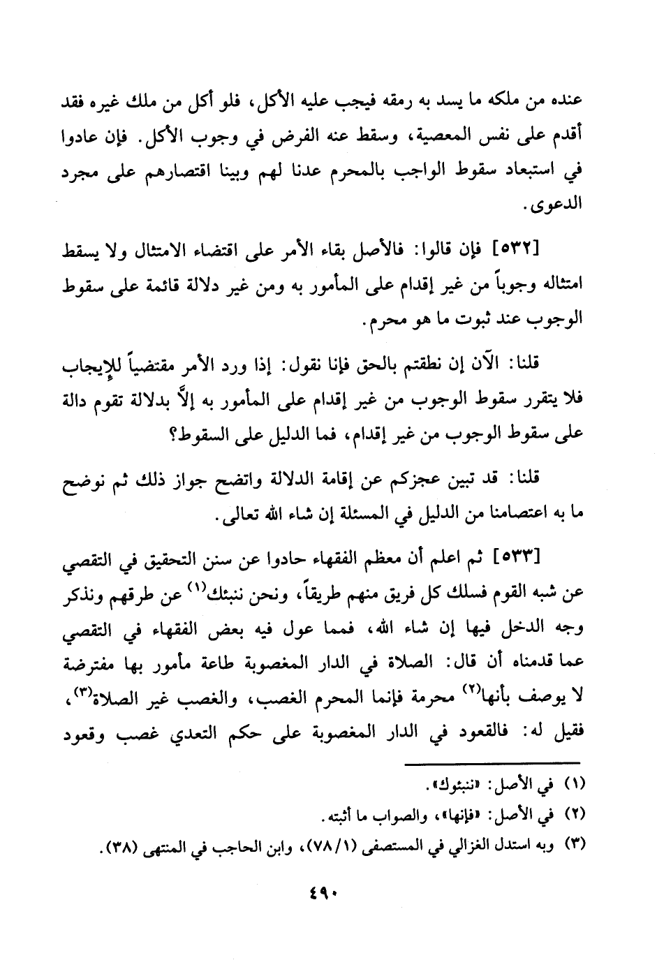 [533] ثمَّ اعْلَم أَن مُعظم الْفُقَهَاء حادوا عَن سنَن التَّحْقِيق فِي التَّقَصِّي عَن شبه الْقَوْم فسلك كل فريق مِنْهُم طَرِيقا، وَنحن ننبئك عَن طرقهم وَنَذْكُر وَجه الدخل فِيهَا إِن شَاءَ الله، فمما عول فِيهِ بعض الْفُقَهَاء فِي التَّقَصِّي عَمَّا قدمْنَاهُ أَن قَالَ: الصَّلَاة فِي الدَّار الْمَغْصُوبَة طَاعَة مَأْمُور بهَا مفترضة لَا يُوصف بِأَنَّهَا مُحرمَة فَإِنَّمَا الْمحرم الْغَصْب، وَالْغَصْب غير الصَّلَاة، فَقيل لَهُ: فالقعود فِي الدَّار الْمَغْصُوبَة على حكم التَّعَدِّي غصب وقعود