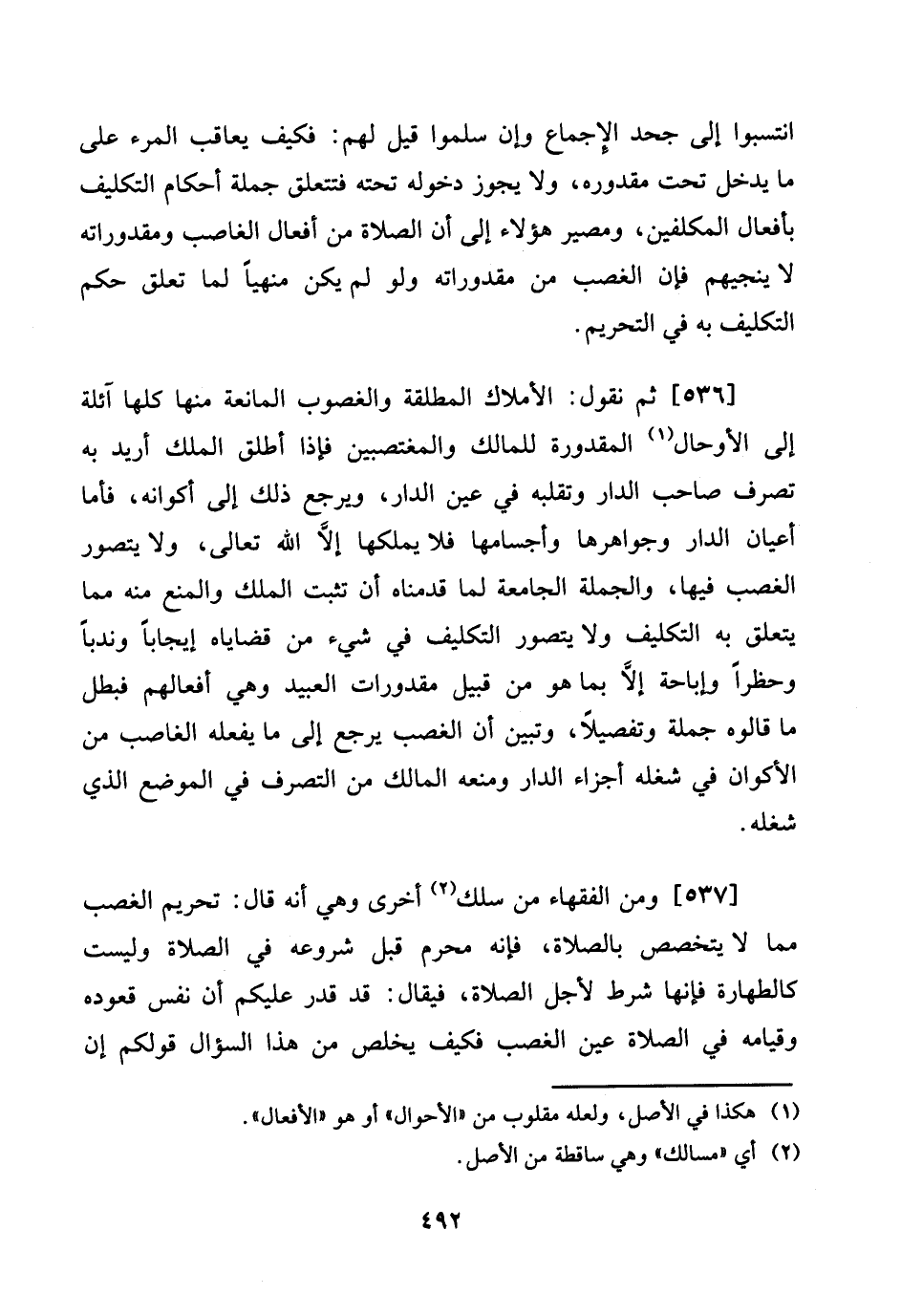 [536] ثمَّ نقُول: الْأَمْلَاك الْمُطلقَة والغصوب الْمَانِعَة مِنْهَا كلهَا آئلة إِلَى الأوحال المقدورة للْمَالِك والمغتصبين فَإِذا أطلق الْملك أُرِيد بِهِ تصرف صَاحب الدَّار وتقلبه فِي عين الدَّار، وَيرجع ذَلِك إِلَى أكوانه، فَأَما أَعْيَان الدَّار وجواهرها وأجسامها فَلَا يملكهَا إِلَّا الله تَعَالَى، وَلَا يتَصَوَّر الْغَصْب فِيهَا، وَالْجُمْلَة الجامعة لما قدمْنَاهُ أَن تثبت الْملك وَالْمَنْع مِنْهُ مِمَّا يتَعَلَّق بِهِ التَّكْلِيف وَلَا يتَصَوَّر التَّكْلِيف فِي شَيْء من قضاياه إِيجَابا وندبا وحظرا وَإِبَاحَة إِلَّا بِمَا هُوَ من قبيل مقدورات العبيد وَهِي أفعالهم فَبَطل مَا قَالُوهُ جملَة وتفصيلا، وَتبين أَن الْغَصْب يرجع إِلَى مَا يَفْعَله الْغَاصِب من الأكوان فِي شغله أَجزَاء الدَّار وَمنعه الْمَالِك من التَّصَرُّف فِي الْموضع الَّذِي شغله.