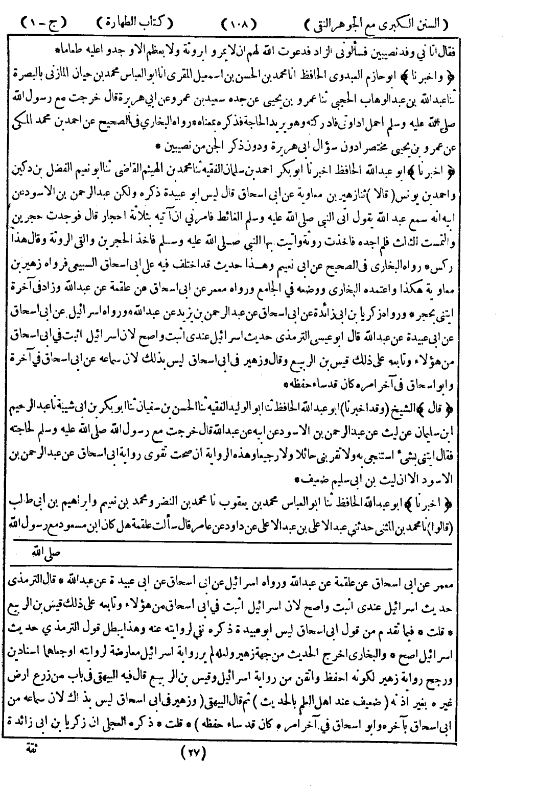 معمر عنابين اسحاق عن علقمة عن عبد الله ورواه اسرائيل عن ابين اسحاق عن ابى عبيدة عن عبد الله * قال الترمذي حديث اسرائيل عندي اثبت واصح لان اسرائيل اثبت في ابى اسحاق من هؤلاء وتابعه على ذلك قيس بن الربيع * قلت * فيما تقدم من قول ابى اسحاق ليس أبو عبيدة ذكره نفي لروايته عنه وهذا يبطل قول الترمذي حديث اسرائيل اصح * والبخاري اخرج الحديث من جهة زهير ولعله لم ير رواية اسرائيل معارضة لروايته اوجعلهما اسنادين ورجح رواته زهير لكونه احفظ واتقن من رواية اسرائيل وقيس بن الربيع قال فيه البيهقى في باب من زرع ارض غيره بغير اذنه (ضعيف عند اهل العلم بالحديث) ثم قال البيهقى (وزهير في ابى اسحاق ليس بذاك لان سماعه من ابى اسحاق بآخره وابو اسحاق في آخر امره كان قدساء حفظه) * قلت * ذكره * العجلى ان زكريا بن ابى زائدة