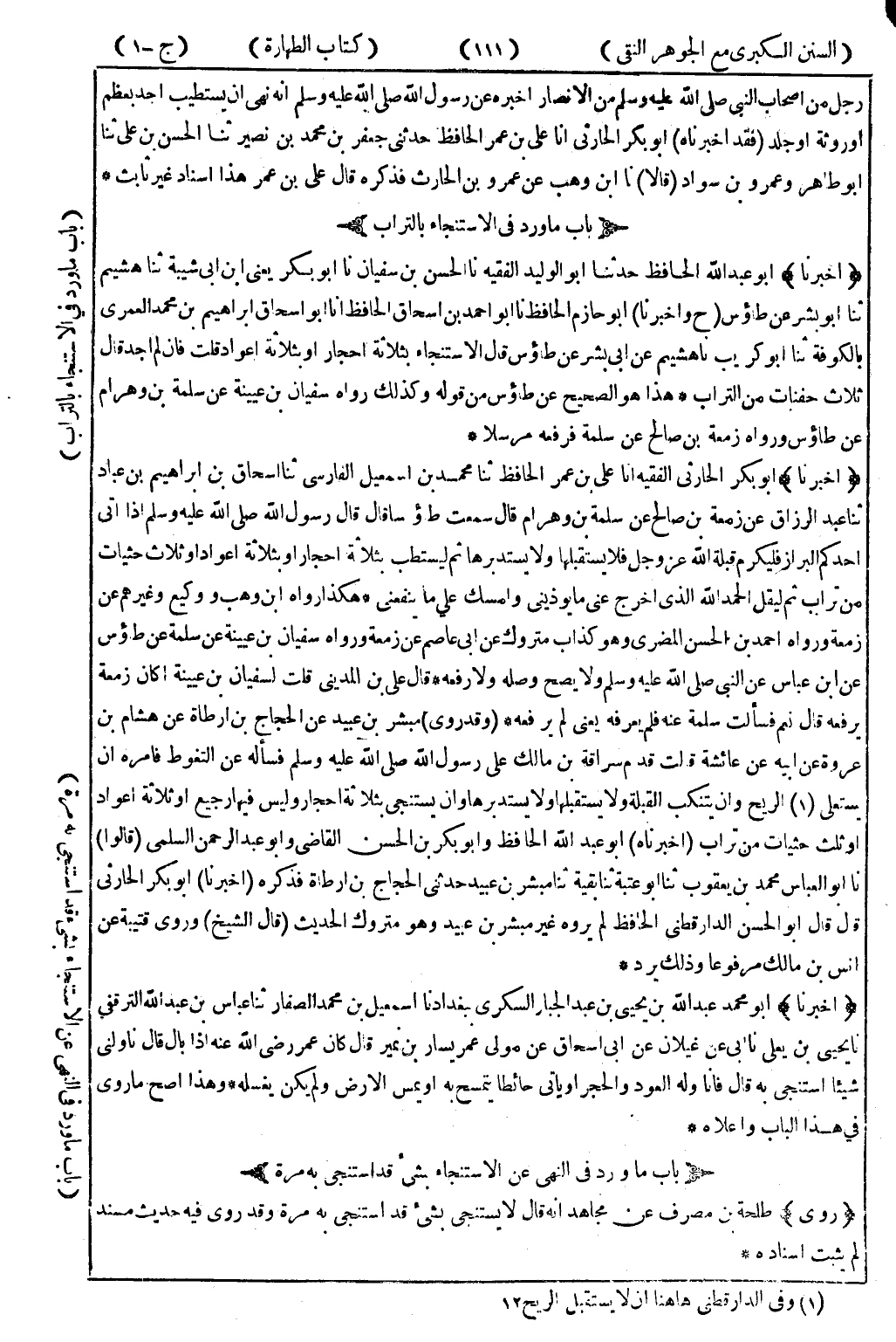 (أخبرنا) أبو محمد عبد الله بن يحيى بن عبد الجبار السكرى ببغداد نا اسمعيل بن محمد الصفار ثنا عباس بن عبد الله الترقفى نا يحيى بن يعلى نا ابى غيلان عن ابى اسحاق عن مولى عمر يسار بن نمير قال كان عمر رضى الله عنه إذا بال قال ناولنى شيئا استنجى به قال فانا وله العود والحجر أو ياتي حائطا يتمسح به أو يمس الارض ولم يكن يغسله.