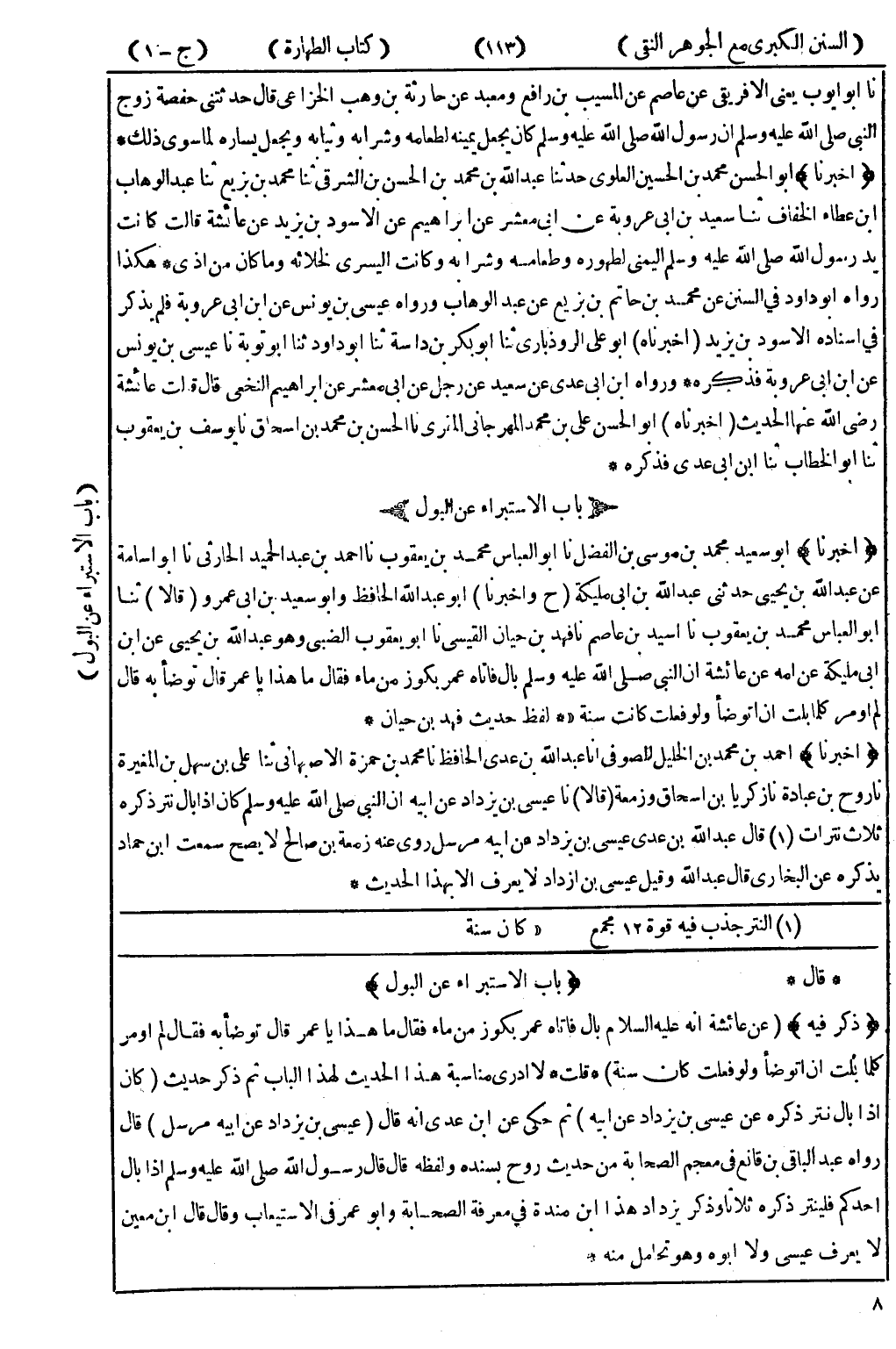* قال * (باب الاستبراء عن البول) (ذكر فيه) (عن عائشة انه عليه السلام بال فاتاه عمر بكوز من ماء فقال ما هذا يا عمر قال توضأ به فقال لم اومر كلما بلت ان اتوضأ ولو فعلت كان سنة) * قلت * لا ادرى مناسبة هذا الحديث لهذا الباب ثم ذكر حديث (كان إذا بال نتر ذكره عن عيسى بن يزداد عن ابيه) ثم حكى عن ابن عدى انه قال (عيسى بن يزداد عن ابيه مرسل) قال رواه عبد الباقي بن قانع في معجم الصحابة من حديث روح بسنده ولفظه قال قال رسول الله صلى الله عليه وسلم إذا بال احدكم فلينتر ذكره ثلاثا وذكر يزداد هذا ابن مندة في معرفة الصحابة وا بو عمر في الاستيعاب وقال قال ابن معين لايعرف عيسى ولا ابوه وهو تحامل منه *