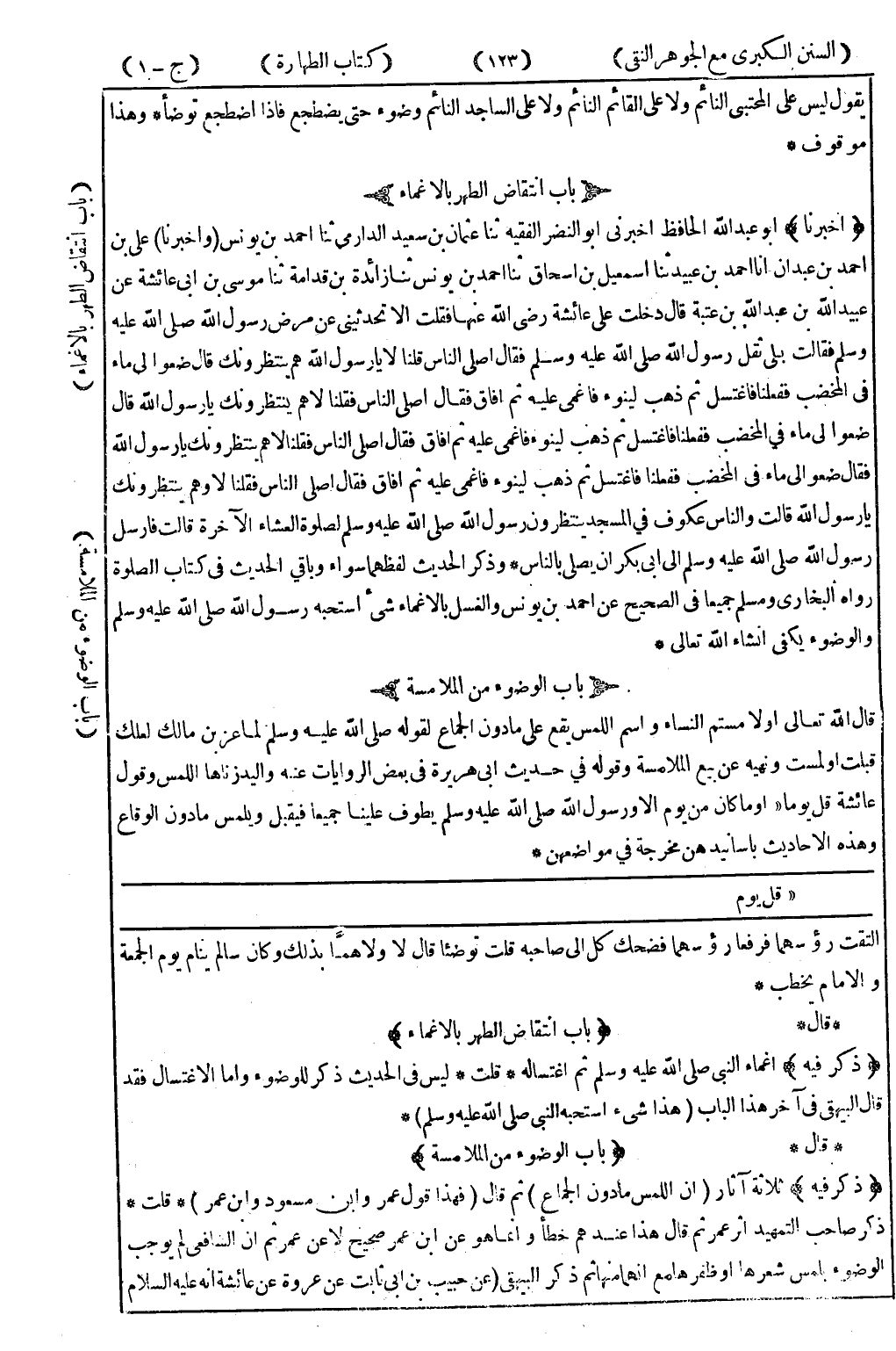 التقت رؤسهما فرفعا رؤسهما فضحك كل إلى صاحبه قلت توضئا قال لا ولا هما بذلك وكان سالم ينام يوم الجمة والامام يخطب * * قال * (باب انتقاض الطهر بالاغماء) (ذكر فيه) اغماء النبي صلى الله عليه وسلم ثم اغتساله * قلت * ليس في الحديث ذكر للوضوء واما الاغتسال فقد قال البيهقى في آخر هذا الباب (هذا شئ استحبه النبي صلى الله عليه وسلم) * * قال * (باب الوضوء من ملامسة) (ذكر فيه) ثلاثة آثار (ان اللمس ما دون الجماع ثم قال (فهذا قال عمرو وابن مسعود وابن عمر) * قلت ذكر صاحب التمهيد اثر عمر ثم قال هذا عندهم خطأ وانما هو عن ابن عمر صحيح لا عن عمر ثم ان الشافعي لم يوجب الوضوء بملس شعرها أو ظفرها مع انهما منها ثم ذكر البيهقى (عن حبيب بنابى ثابت عن عروة عن عائشة عليه السلام