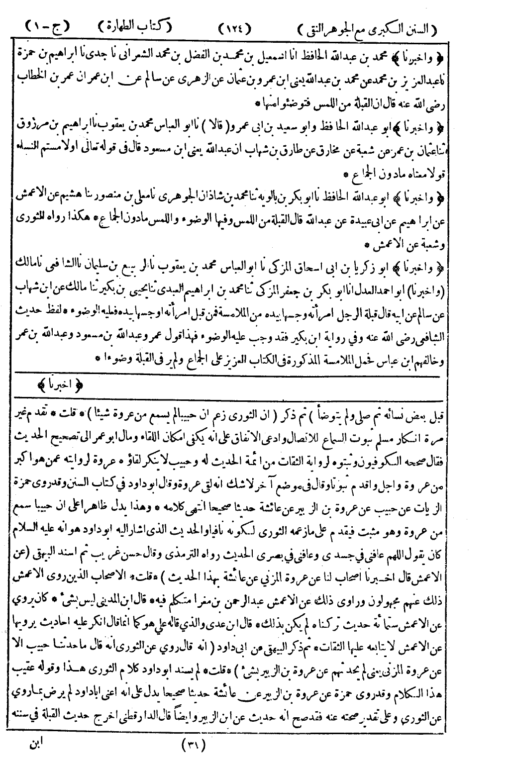 قبل بعض نسائه ثم صلى ولم يتوضا) ثم ذكر (ان الثوري زعم ان حبيبا لم يسمع من عروة شيئا) * قلت * تقدم غير مرة انكار مسلم ثبوت السماع للاتصال وادعى الاتفاق على انه يكفى امكان اللقاء وما أبو عمر إلى تصحيح الحديث فقال صحح الكوفيين وثبتوه لرواية الثبات من ائمة الحديث له وحبيب لا ينكر لقاؤه عروة لروايته عمن هوا كبر من عروة واجل واقدم ثبوتا وقال في موضع آخر لا شك انه لقى عروة وقال أبو داود في كتاب السنن وقد روى حمزة الزيات عن حبيب عن عروة بن الزبير عن عائشة حديثا صحيحا انتهى كلامه * وهذا يدل ظاهرا على ان حبيبا سمع من عروة وهو مثبت فيقدم على ما زعمه الثوري لكونه نافيا والحديث الذى اشار إليه أبو داود هو انه عليه السلام كان يقول اللهم عافني في جسدي وعافنى في بصرى الحديث رواه الترمذي وقال حسن غريب ثم اسند البيهقى (عن الاعمش قال ابخر اصحاب لنا عن عروة المزني عن عائشة بهذا الحديث) * قلت * الاصحاب الذين روى الاعمش ذلك عنهم مجهولون ورانى ذلك عن الاعمش عبد الرحمن بن مغرا متلكم فيه * قال ابن المدينى ليس بشئ * كان يروي عن الاعمش ستمائة حديث تركناه لم يكن بذلك * قال ابن عدى والذي قاله علي هو كما انما قال انكر عليه احاديث يرويها عن الاعمش لا يتابعه عليها الثقات * ثم ذكر البيهقى عن ابى داود (انه قال روي عن الثوري انه قال ما حدثنا حبيب الا عن عروة المونى يعنيلم يحدثهم عن عروة بن الزبير عن عائشة حديثا صحيحا يدل على انه اعني ابا داود لم يرض بما روي