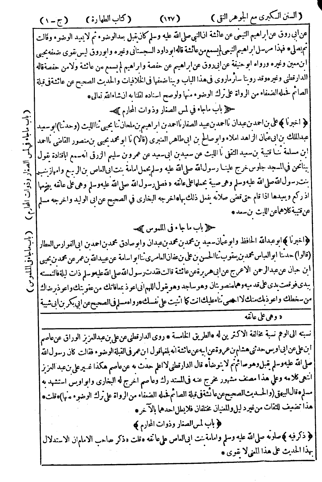 نسبته إلى الوهم نسبة مخالفة الاكثر ين له * الطريق الخامسة * روى الدارقطني عن على بن عبد العزيز الوراق عن عاصم ابن على عن ابى اويس حدثنى هشام بن عروة عن ابيه عن عائشة انه بلغها قول ابن عمر في القبلة الوضوء فقالت كان رسول الله صلى الله عليه وسلم يقبل وهو صائم ثم لا يتوضأ * قال الدارقطني لا اعلم حدث به عن عاصم هكذا غير على بن عبد العزيز انتهى كلامه وعلي هذا مصنف مشهو مخجر عنه في المستدرك وعاصم اخرج له البخاري وابو اويس استشهد به مسلم * قال البيهقى (والحديث الصحيح عن عائشة في قبلة الصائم فحمله الضعفاء من الرواة على ترك الوضوء منها) * قلت * هذا تضعيف للثقات من غير دليل والمعنيان مختلفان فلا يعلل احدهما بالآخر *