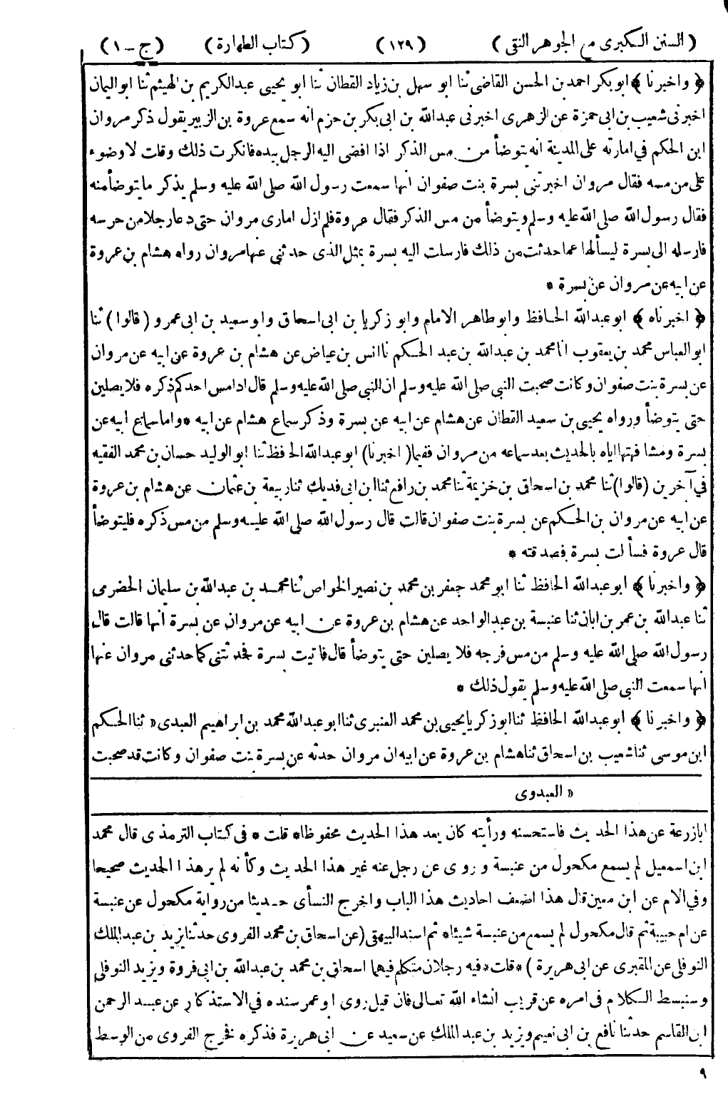 ابا زرعة عن هذا الحديث فاستحسنه ورأيته كان يعد هذا الحديث محفوظا * قلت * في كتاب الترمذي قال محمد ابن اسمعيل يم يسمع مكحول من عنبسة وروى عن رجل عنه غير هذا الحديث وكأنه لم ير هذا لا حديث صحيحا وفي الام عن ابن معين قال هذا اضعف احاديث هذا الباب واخرج النسأى حديثا من رواية مكحول عن عنبسة عن ام حبيبة ثم قال مكحول لم يسمع من عنبسة شيئا * ثم اسند البيهقى (عن اسحاق بن محمد الفروى حدثنا يزيد بن عبد الملك النوفلي عن المقبرى عن ابى هريرة) * قلت * فيه رجلان متكلم فيهما اسحاق بن محمد بن عبد الله بن ابى فروة ويزيد النوفلي وسنبسط الكلام في امره عن قريب انشاء الله تعالى فان قيل روى أو عمر سنده في الاستذكار عن عبد الرحمن ابى القاسم حدثنا نافع بن ابى نعيم ويزيد بن عبد الملك عن سعيد عن ابى هريرة فذكره مخرج الفروى من الوسط