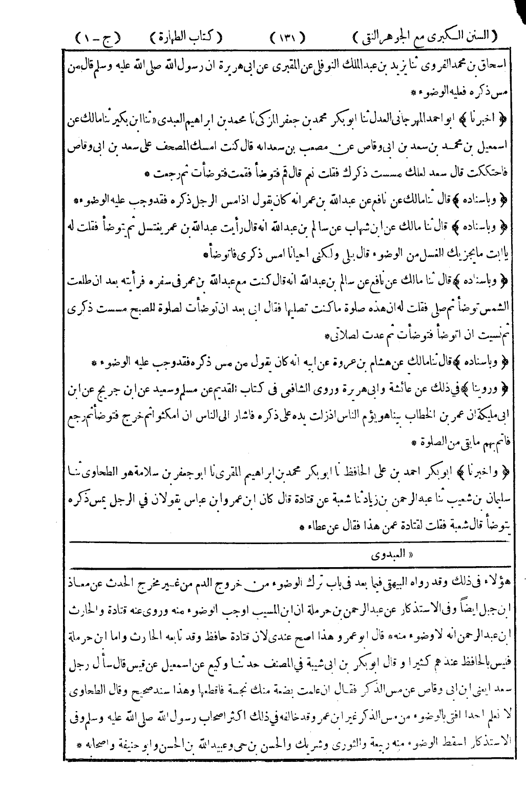 هؤلاء في ذلك وقد رواه البيقهى فيما بعد في باب ترك الضوء من خروج الدم من غير مخرج الحدث عن معاذ ابن جبل ايضا وفيا لاستذكار عن عبد الرحمن بن حرملة ان ابن المسيب اوجب الوضوء منه وروى عنه قتادة والحارث ابن عبد الرحمن انه لا وضوء منه * قالا أبو عمرو هذا اصح عند ى لان قتادة حافظ وقد تابعه الحارث واما ابن حرملة فليس بالحافظ عندهم كثيرا وقال أبو بكر بن ابى شيبة في المصنف حدثنا وكيع عن اسمعيل عن قيس قال سأل رجل سعد ايعين ابن ابى وقال عن مس الذكر فقال ان علمت بضعة منك نجسة فاقطعها وهذا سند صحيح وقال الطحاوي لا نعلم احدا افتى بالوضوء من مس الذكر غير ابن عمر وقد خالفه في ذلك اكثر اصحاب رسول الله صلى الله عليه وسلم وفى الاستذكار اسقط الوضوء منه ربيعة والثوري وشريك والحسن حى وعبيد الله بن الحسن وابو حنيفة واصحابه *