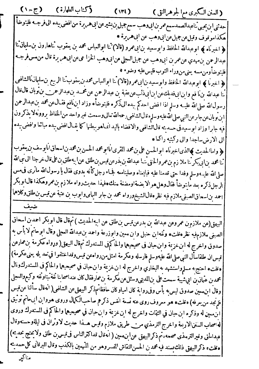 البيهقى (عن ملازم بن عمرو وعن عبد الله بن بدر عن قيس بن طلق عن ابيه الحديث) ثم قال قال أبو بكر احمد بن اسحاق الصبغى ملازم فيه نظر * قلت * وثقه ابن حنبل وابن معين وابو زرعة واحمد بن عبد الله العجلى وقال أبو حاتم لا بأس به صدوق واخرج له ابن خزيمة وابن حبان في صحيحهما والحاكم في المستدرك ثم قال البيهقى (ورواه عكرمة بن عمار عن اقيس ان طلقا سأل النبي صلى الله عليه وسلم فارسله وعكرمة امثل من رواه عن قيس وقد اختلفوا في تعديله يعنى عكرمة) * قلت * احتج به مسلم واستهشد به البخاري واخرج له ابن خزيمة وابن حبان في صحيحهما والحاكم في المستدرك وقال محمد بن عثمان بن ابي شيبة سمعت على بن المدينى وسئل عن عكرمة بن عمار فقال كان عند اصحابنا ثقة ثبتا وثقه وكيع العجلى وقال ابن معين صدوق ليس به بأس وفى رواية كان اومياو كان حافظا ثم ذكر البيهقى عن الشافعي (انه قال سألنا عن قيس فلم نجد من يعرفه) * قلت * هو معروف روى عنه تسعة انفس ذكرهم صاحب الكمال وروى هو وابن ابى حاتم توثيق ابن معين له وذكره ابن حبان في الثقات واخرج له ابن خزيمة وابن حبان في صحيحهما والحاكم في المستدرك وروى له اصحاب السنن الاربعة واخرج الترمذي من طريق ملازم وقيس هذا حديث لا وتران في ليلة وحسنه وقال عبد الحق وغير الترمذي صححه ثم ذكر البيهقى عن ابن معين (انه قال قد اكثر الناس في قيس بن طاق ولا يحتج بحديثه) * قلت * ذكر البيهقى ذلك بسند فيه محمد بن الحسن النقاش المفسر وهو من المتهمين بالكذب وقال البرقانى كل حديثه