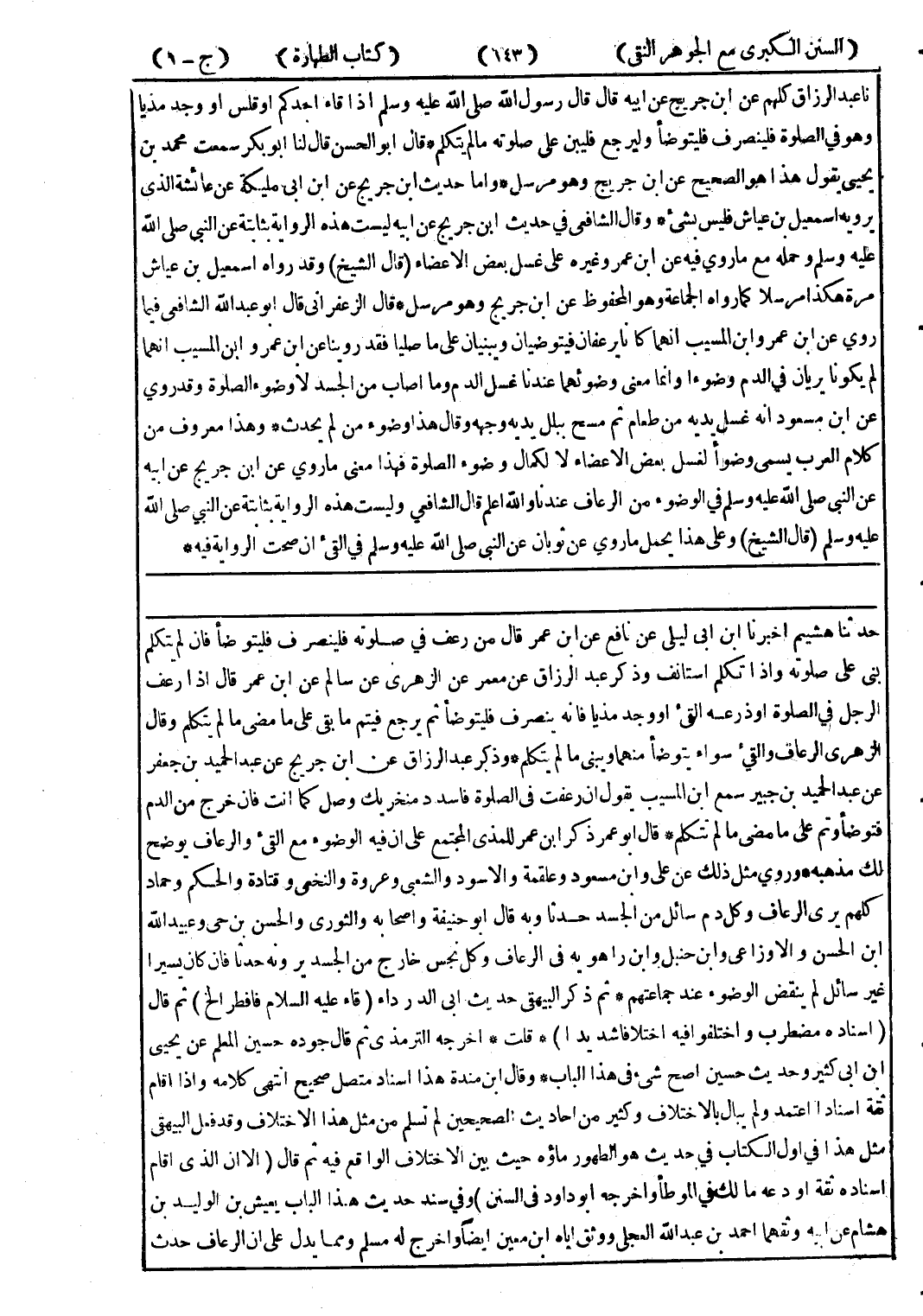 حدثنا هشيم اخبرنا ابن ابى ليلى عن نافع عن ابن عمر قال من رعف في صلوته فلينصرف فليتوضأ فان لم يتلكم بنى على صلوته وإذا تكلم استانف وذكر عبد الرزاق عن معمر عن الزى عن سالم عن ابن عمر قال إذا رعف الرجل في الصلوة أو ذرعه القئ أو وجد مذيا فانه ينصرف فليتوضأ ثم يرجع فيتم ما بيقى على ما مضى ما لم يتكلم وقال الزهري الرعاف والقئ سواء يتوض أمنهما وينبى ما لم يتكلم * وذكر عبد الرزاق عن ابن جريج عن عبد الحميد بن جعفر عن عبد الحميد بن جبير سمع ابن المسيب يقول ان رعفت في الصلوة فاسدد منخريك وصل كمانت فان خرج من الدم