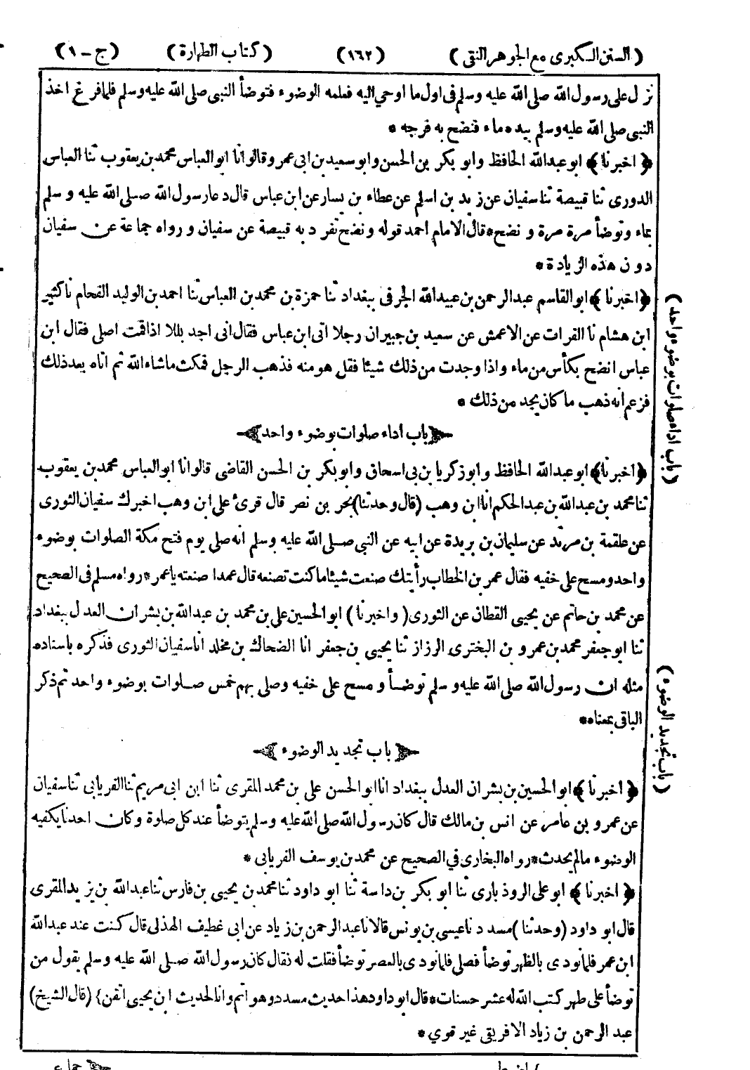 (أخبرنا) أبو على الروذبارى ثنا أبو بكر بن داسة ثنا أبو داود ثنا محمد بن يحيى بن فارس ثنا عبد الله بن يزيد المقرى قال أبو داود (وحدثنا) مسدد نا عيسى بن يونس قالا نا عبد الرحمن بن زياد عن ابى غطيف الهذلى قال كنت عند عبد الله ابن عمر فلما نودى بالظهر توضأ فصلى فلما نودى بالعصر توضأ فقلت له فقال كان رسول الله صلى الله عليه وسلم يقول من