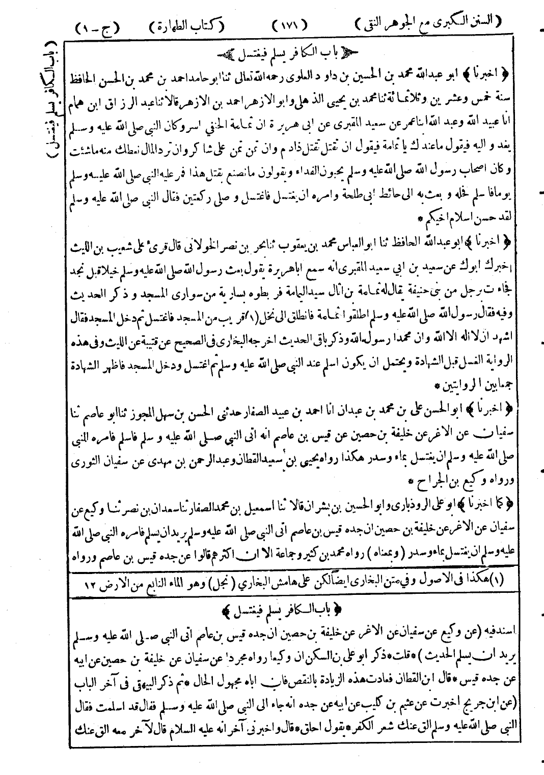 (باب الكافر يسلم فيغتسل) اسند فيثه (عن وكيع عن سفيان عن الاغر عن خليفة بن حصين ان جده قيس بن عاصم اتى النبي صلى الله عليه وسلم يردان يسلم الحديث) * قلت * ذكر أبو على بن السكن ان وكيعا رواه مجردا عن سفيان عن خليفة بن حصين عن ابيه عن جده قيس * قال ابن القطان فعادت هذه الزيادة بالنقص فان ابان مجهول الحال * ثم ذكر البيهقى في آخر الباب (عن ابن جريج اخبرت عن عثيم بن كليب عن ابيه عن جده انه جاء إلى النبي صلى الله عليه وسلم فقال قد اسملت فقال النبي صلى الله علهى وسلم الق عنك شعر الكفر * يقول احلق * قال واخبرني آخرانه عليه السلام قال لآخر معه الق عنك
