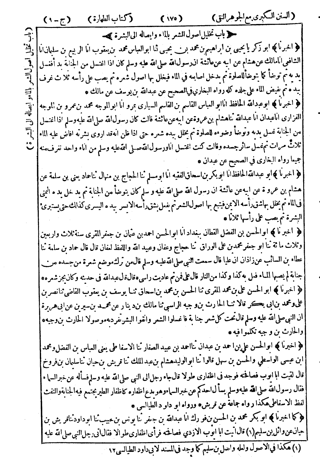 (أخبرنا) أبو الحسن على بن محمد المقرى ثنا الحسن بن محمد بن اسحاق ثنا يوسف بن يعقوب القاضى ثنا نصر بن على ومحمد بن ابى بكر قالا ثنا الحارث بن وجيه الراسبى ثنا مالك بن دينار عن محمد بن سيرين عن ابى هريرة ان النبي صلى الله عليه وسلم قال تحت كل شعر جنابة فاغسلوا الشعر وانقوا البشر تفرد به موصولا الحارث بن وجيه.