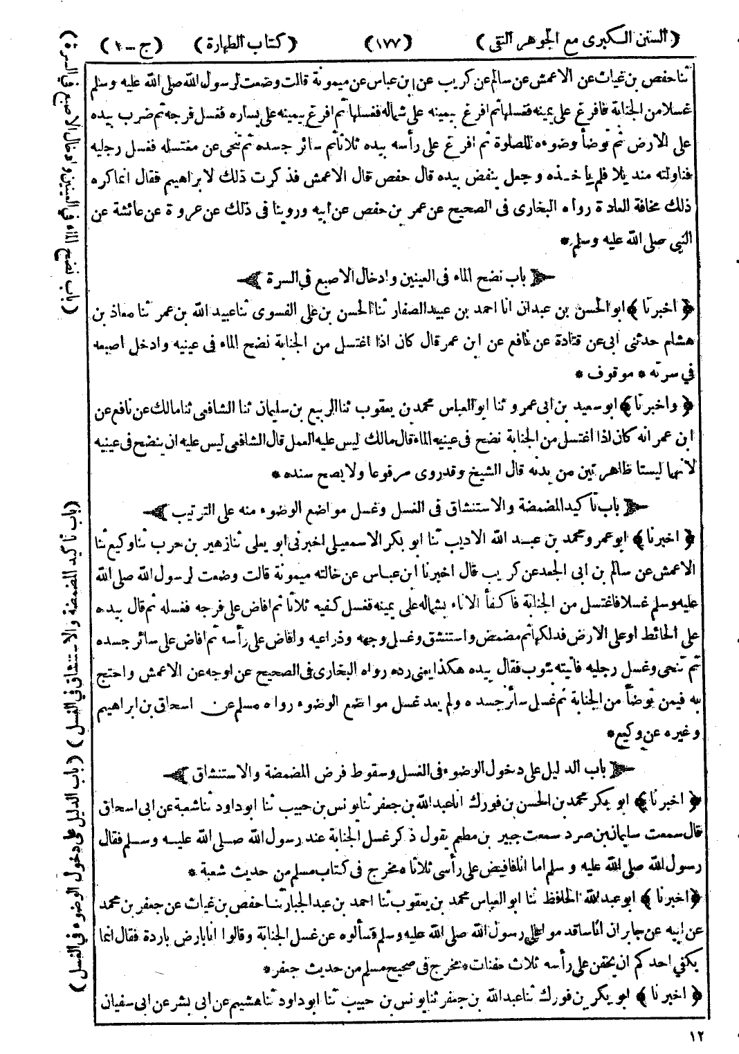 (أخبرنا) أبو الحسن بن عبدان انا احمد بن عبيد الصفار ثنا الحسن بن على الفسوى ثنا عبيدالله بن عمر ثنا معاذ بن هشام حدثنى ابى عن قتادة عن نافع عن ابن عمر قال كان إذا اغتسل من الجنابة نضح الماء في عينيه وادخل اصبعه في سرته.
