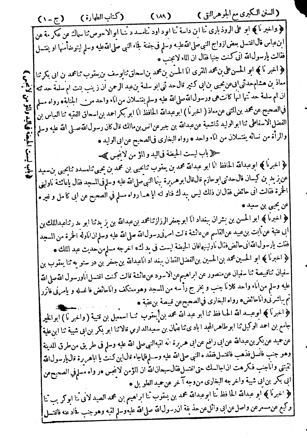 (وأخبرنا) أبو الخير جامع بن احمد الوكيل ثنا أبو طاهر المجدابادى ثنا عثمان بن سعيد الدارمي قالا ثنا أبو بكر بن ابى شيبة ثنا ابن علية عن حميد عن بكر بن عبد الله عن ابى رافع عن ابى هريرة انه لقيه النبي صلى الله عليه وسلم في طريق من طرق المدينة وهو جنب فانسل فذهب فاغتسل ففقده النبي صلى الله عليه وسلم فلما جاء قال اين كنت يا ابا هريرة قال يا رسول الله لقيتني وانا جنب فكرهت ان اجالسك حتى اغتسل فقال سبحان الله ان المؤمن لا ينجس.