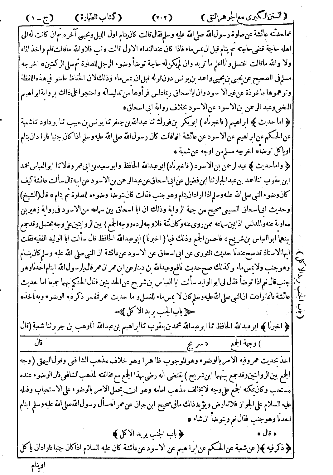 اخذ بحديث عمرو فيه الامر بالوضوء وهو للوجوب ظاهرا وهو خلاف مذهب الشافعي وقول البيهقى (وجه الجمع بين الروايتين وقد وجمع بينهما ابن شريح) يقتضى انه رضى بهذا الجمع مع مخالفته لمذهب الشافعي فان الوضوء عنده مستحب وكان يمكنه الجمع على وجه لا يخالف امام وهوان يحمل الامر بالوضوء على الاستحباب وفعله عليه السلام على الجوز فلا تعارض ويؤيد ذلك ما في صحيح ابن حبان عن عمر انه سأل رسول الله صلى الله عليه وسلم اينام احدنا وهو جنب فقال نعم ويتوضأ ان شاء * * قال * (باب الجنب يريد الاكل) (ذكر فيه) (عن شعبة عن الحكم عن ابراهيم عن الاسود عن عائشة كان عليه السلام إذا كان حنبا فارادان ياكل