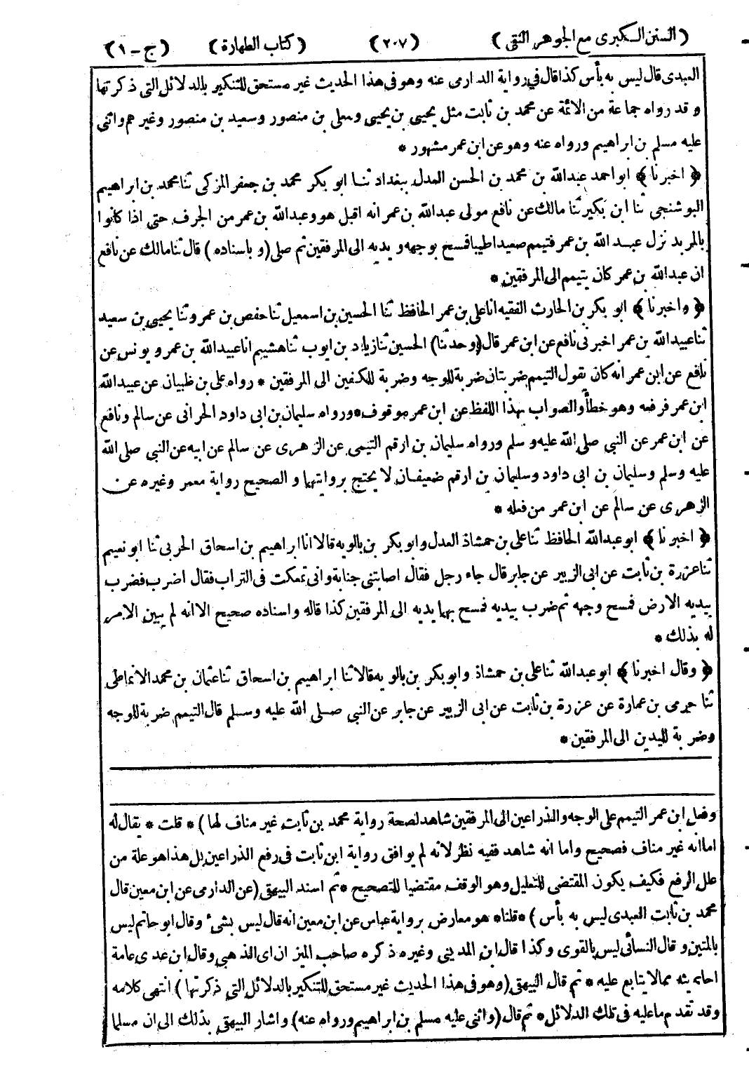 وفعل ابن عمر التيمم على الوجه والذارعين إلى المرفقين شاهد لصحة رواية محمد بن ثابت غير مناف لها) * قلت * يقالله اما انه غر مناف فصحيح واما انه شاهد ففيه انظر لانه لم يوافق رواية ابن ثابت في رفع الذارعين بل هذا هو علة من علل الرافع فكيف يكون المتقضى التعليل وهو الوقف مقتضيا للتصحيح * ثم اسند البيهقى (عن الدرامى عن ابن معين قال