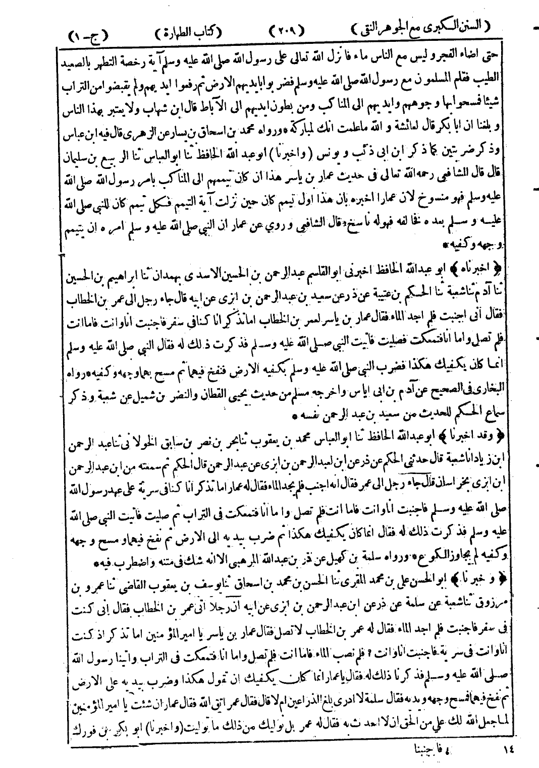 (وقد اخبرنا) أبو عبد الله الحافظ ثنا أبو العباس محمد بن يعقوب ثنا بحر بن نصر بن سابق الخولانى ثنا عبد الرحمن ابن زياد انا شعبة قال حدثنى الحكم عن ذر عن ابن لعبد الرحمن بن ابزى عن عبد الرحمن قال الحكم ثم سمعته من ابن عبد الرحمن ابن ابزى بخراسان قال جاء رجل إلى عمر فقال انه اجنب فلم يجد الماء فقال له عمار اما تذكر انا كنا في سرية على عهد رسول الله صلى الله عليه وسلم فاجنبت انا وانت فاما انت فلم تصل واما انا فتمعكت في التراب ثم صليت فاتيت النبي صلى الله عليه وسلم فذكرت ذلك له فقال انما كان يكفيك هكذا ثم ضرب بيديه إلى الارض ثم نفخ فيهما ومسح وجهه وكفيه لم يجاوز الكوع.