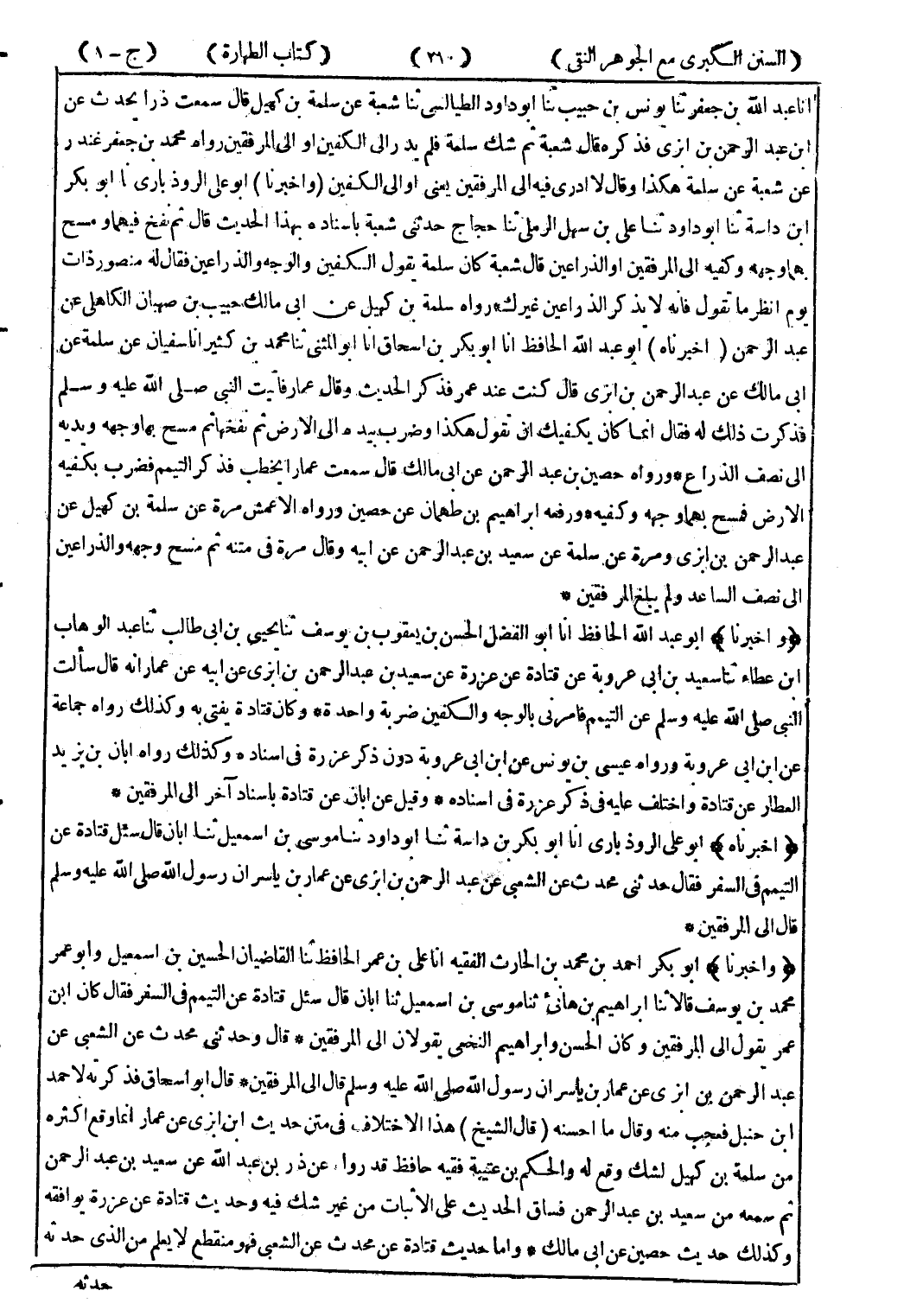 (اخبرناه) أبو على الروذبارى انا أبو بكر بن داسة ثنا أبو داود ثنا موسى بن اسمعيل ثنا ابان قال سئل قتادة عن التيمم في السفر فقال حدثنى محدث عن الشعبى عن عبد الرحمن بن ابزى عن عمار بن ياسر ان رسول الله صلى الله عليه وسلم قال إلى المرفقين.