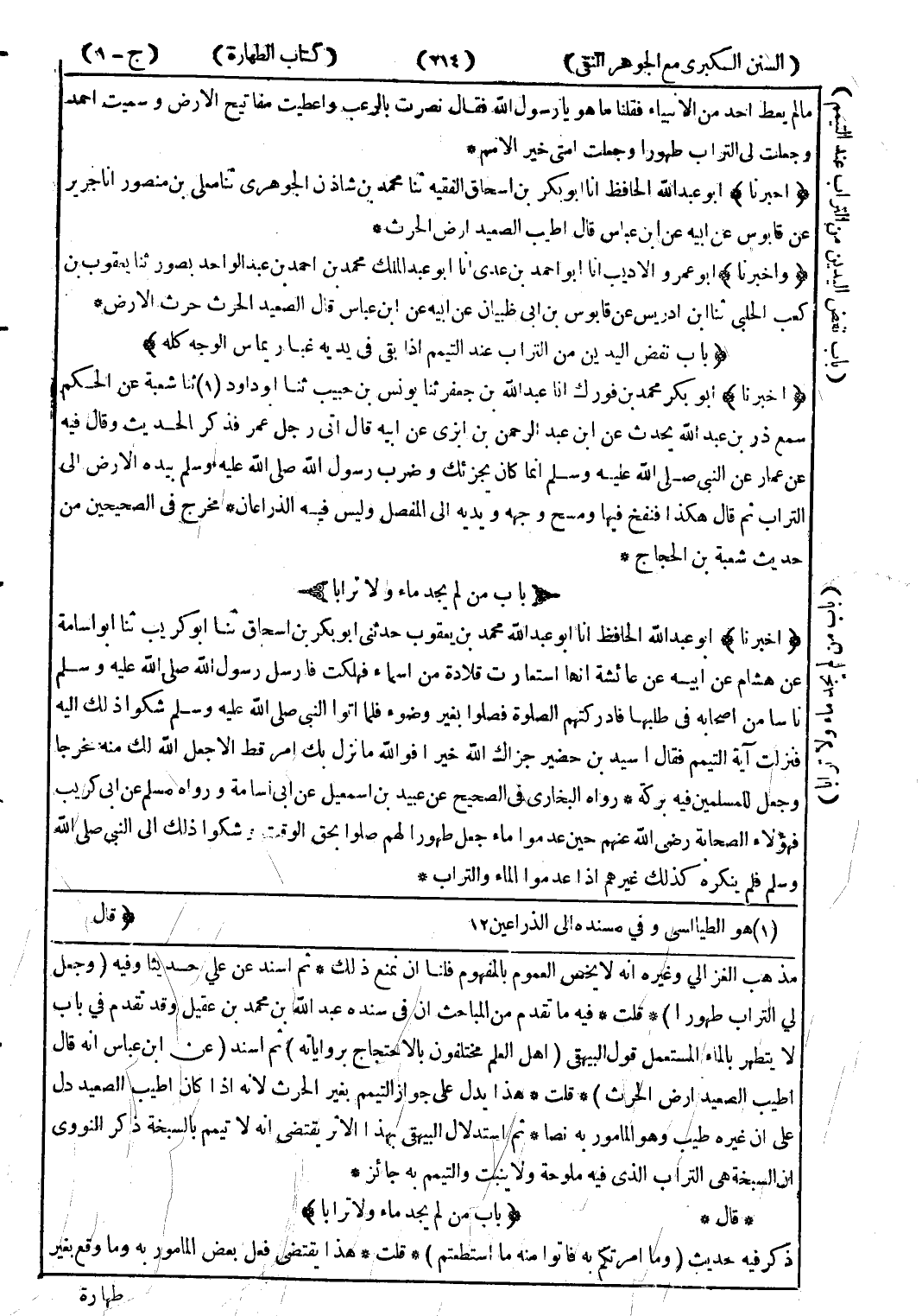 مذهب الغزالي وغيره انه لا يخص العموم بالمفهوم فلنا ان نمنع ذلك * ثم اسند عن علي حديثا وفيه (وجعل لي التراب طهورا) قلت * فيه ما تقدم من المباحث ان في سنده عبد الله بن محمد بن عقيل وقد تقدم في باب لا يتطهر المستعمل قول البيهقى (اهل العلم مختلفون بالاحتجاج برواياته) ثم اسند (عن ابن عباس انه قال اطيب الصعيد ارضا لحرث) * قلت * هذا يدل على جواز التيمم بغير الحرث لانه إذا كان اطيب الصعيد دل على ان غيره طب وهو المأمور به نصا * ثم استدلال البيهقى بهذا الاثر يقتض يانه لا تيمم بالسبخة ذكر النووي ان السبخة هي الترا بالذى فيه ملوحة ولا ينبت والتميم به جائز * * قال * (باب من لم يجد ماء ولا ترابا) ذكر فيه حديث (ما امرتكم به فاتوا منه ما استطعتم) * قلت * هذا يقتضى فعل بعض المأمور به وما وقع بغير *