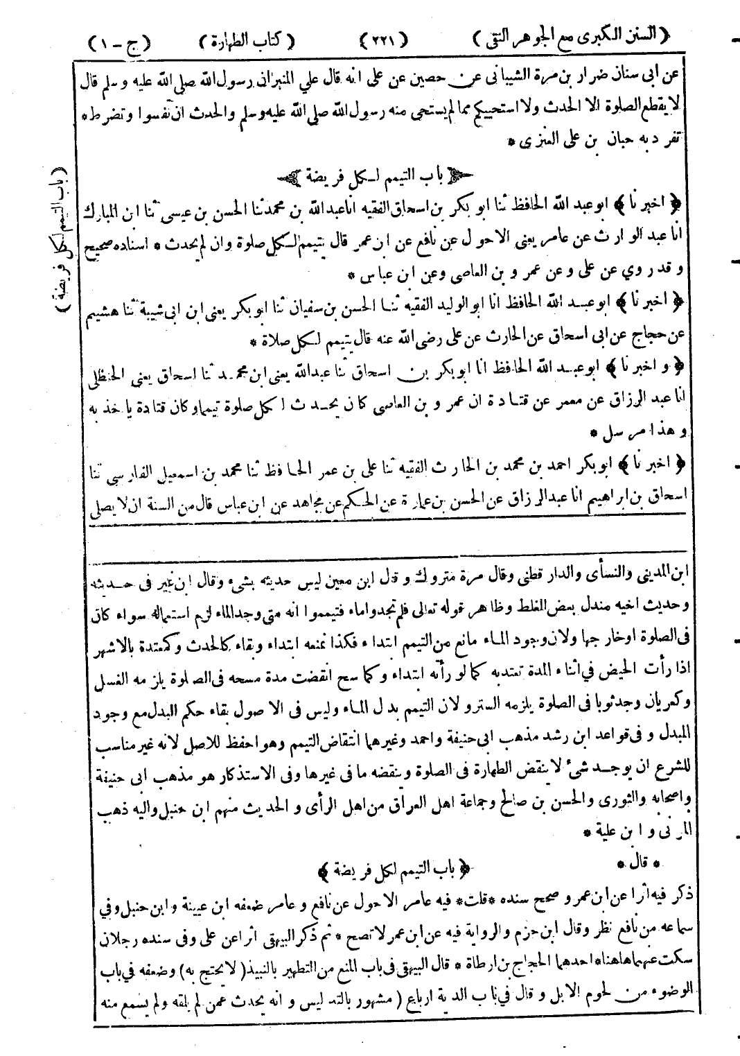 ابن المدينى والنسأى والدارقطني وقال مرة متروك وقال ابن معين ليس حديثه بشئ وقا لابن غير في حديثه وحديثا خيه مندل بعض الغلط وصاهر قوله تعالى فلم تجدوا ماء فتيمموا انه متى وجد الماء لزم استعماله سواء ان في الصلوة أو خار جها ولان وجود الماء مانع من التيمم فكذا نمنعه ابتداء وبقاء كالحدث وكمعتدة بالاشهر إذا رأيت الحيض في اثناء المدة تعتد به كما لو رأته ابتداء وكما سح انقضت مدة مسحه في الصلوة يلزمه بالاشهر إذا رأت الحيض في اثناء المدة تعتد به كما لو رأته ابتداء وكما سح انقضت مدة مسحه في الصلوة يلزمه الغسل وكعريا وجد ثوبا في الصلوة يمزله السترو لان التميم بدل الماء لى في الاصول بقاء حكم البد مع وجو المبدل وفى قواعدابن رشد مذهب أي حنفية واحمد وغيرهما انقاض التيمم وهو احفظ للاصل لانه غير مناسب للشرع ان يوجد شئ لا ينقض الطهارة في الصلوة وينقضه ما في غيرها وفى الاستذكار هو مذهب ابى حنفية واصحابه والثوري والحسبن صالح وجماعة اهل العراق من اهلا لرأى والحديث منهم ابن حنبل واليه ذهب المرزنى وانب علية * * قال * (باب التيمم لكل فريضة) ذكر فيه اثرا عن ابن عمرو صحح سنده * قلت * فيه عامر الاحول عن نافع وعامر ضعفه ابن عيينة وابن حنبل وفي ماعسه من نافع نظر وقال بن حزم والرواية فيه عن ابن عمر لا تصح * ثم ذكر البيهقى اثرا عن على وفى سنده رجلان سكت عنهما هاهنا * احدهما الحجاج بن ارطاة * قال البيهقى في باب المنع من التطهير بالنبيذ (لا يحتج به) وضعفه في باب الوضوء من لحوم الابل وقال في باب الدية ارباع (مشهور بالتدليس وانه يحدث عمن لم يلقه ولم يسمع منه