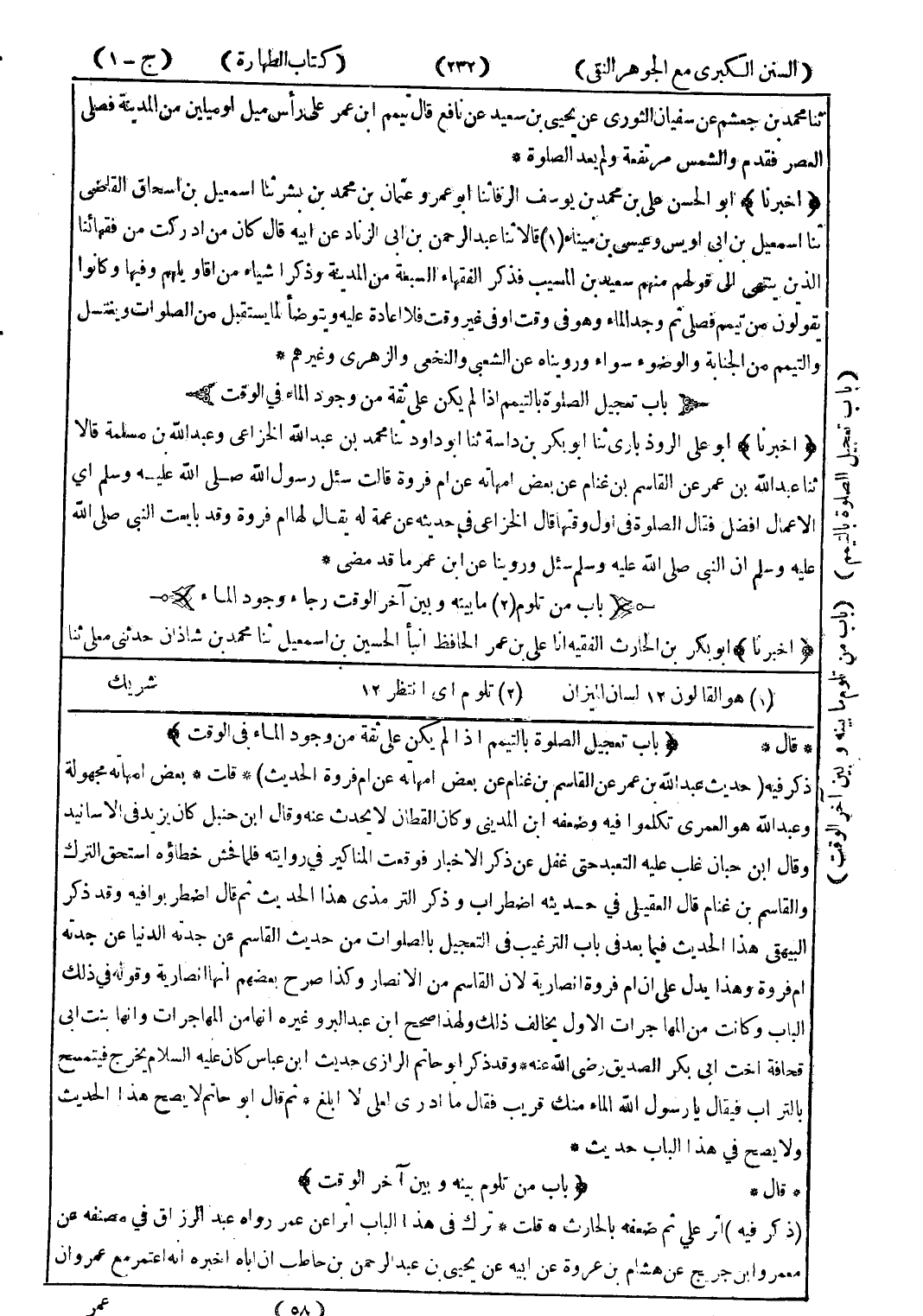 * قال * (باب تعجيل الصلوة بالتيمم إذا لم يكن على ثقة من جود الماء في الوقت) ذكر فيه (حديث عبد الله بن عمر عن القاسم بن غنام عن بعض امهاته عن ام فروة الحديث) * قلت * بعض امهاته مجهولة وعبد الله هو العمري تكلموا فيه وضعفه ابن المدينى وكان القطان لا يحدث عنه وقال ابن حنبل كان يزيد في الاسانيد وقال ابن حبان غلب عليه التعبد حتى غفل عن ذكر الاخبار فوقعت المناكير في روايته فلما فحش خطاؤه استحق الترك والقاسم بن غنام قال العقيلى في حديثه اضطراب وذكر الترمذي هذا الحديث ثم قال اضطربوا فيه وقد ذكر البيهقى هذا الحديث فيما بعد في باب الترغيب في التعجيل بالصلوات من حديث القاسم عن جدته الدنيا عن جدته ام فروة وهذا يدل على ان ام انصارية لان القاسم من الانصار وكذا صرح بعضهم انها انصارية وقوله في ذلك الباب وكانت من المهاجرات الاول يخالف ذلك ولهذا صحح ابن عبد البرو غيره انها من المهاجرات وانها بنت ابى قحافة اخب ابى بكر الصديق رضى الله عنه * وقد ذكر أبو حاتم الرازي حديث ابن عباس كان عليه السلام يخرج فيتمسح بالتراب فيقال يا رسول الله منك قرب فقال ما ادرى لعلى لا ابلغ * ثم قال أبو حاتم لا يصح هذا الحديث ولا يصح في هذا الباب حديث * * قال * (باب من تلوم بينه وبين آخر الوقت) (ذكر فيه) اثر علي ثم ضعفه بالحارث * قلت * ترك في هذا الباب اثرا عن عمرو رواه عبد الرزاق في مصنفه عن معمرو ابن جريج عن هشام بن عروة عن ابيه عن يحيى بن عبد الرحمن بن حاطب ان اباه اخبره انه اعتمر مع عمران