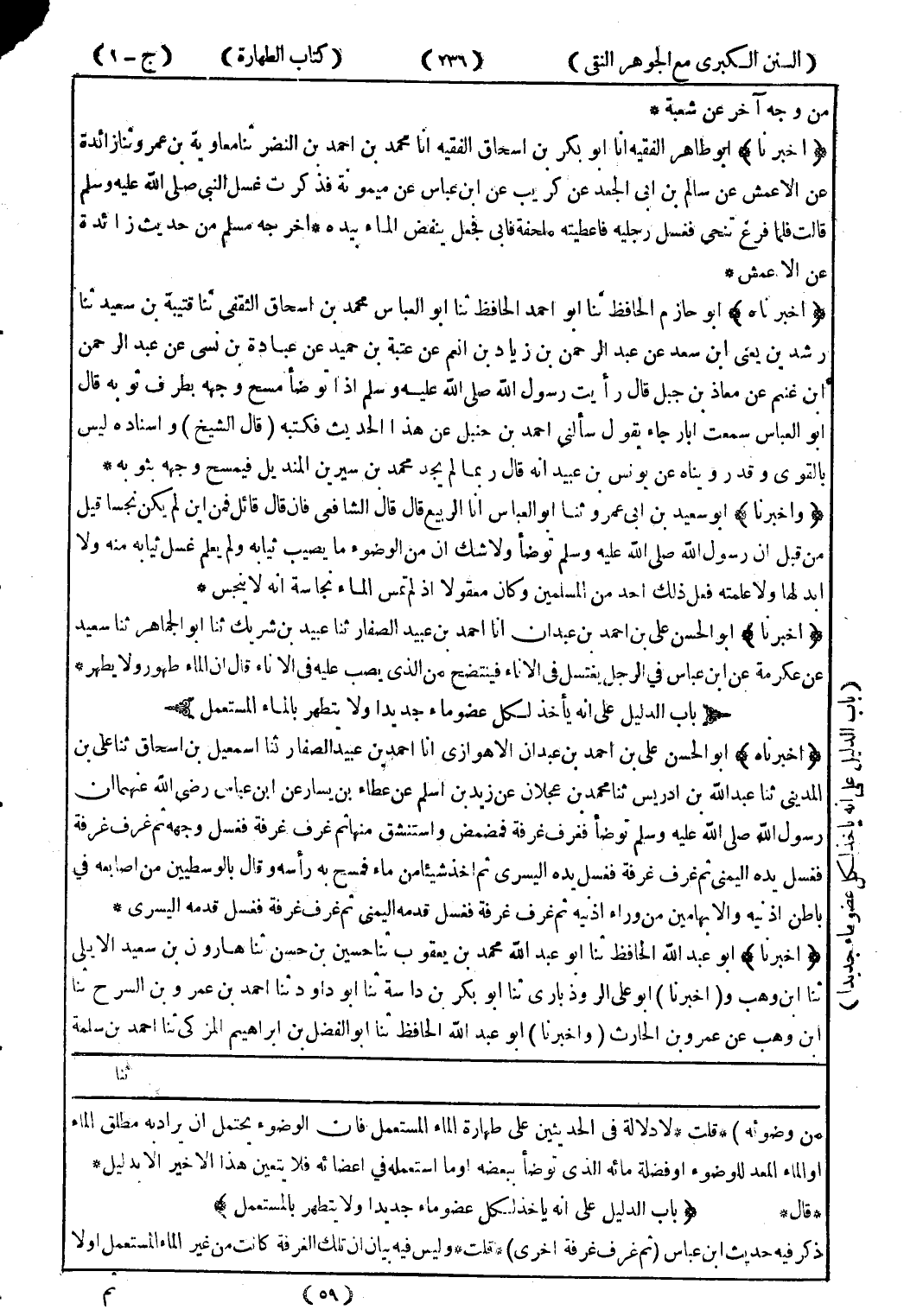 من وضوئه) * قلت * لا دلالة في الحديثين على طهارة الماء المستعمل فان الوضوء يحتمل ان يراد به مطلق الماء أو الماء المعد للوضوء أو فضلة مائة الذى توضأ ببعضه أو ما استعمله في اعضائه فلا يتعين هذا الاخير الا بدليل * * قال * (باب الدليل على انه ياخذ لكل عضوماء جديدا ولا يتطهر بالمستعمل) ذكر فيه حديث ابن عباس (ثم غرف غرقه اخرى) * قلت * وليس فيه بيان ان تلك الغرفة كانت من غير الماء المستعمل اولا