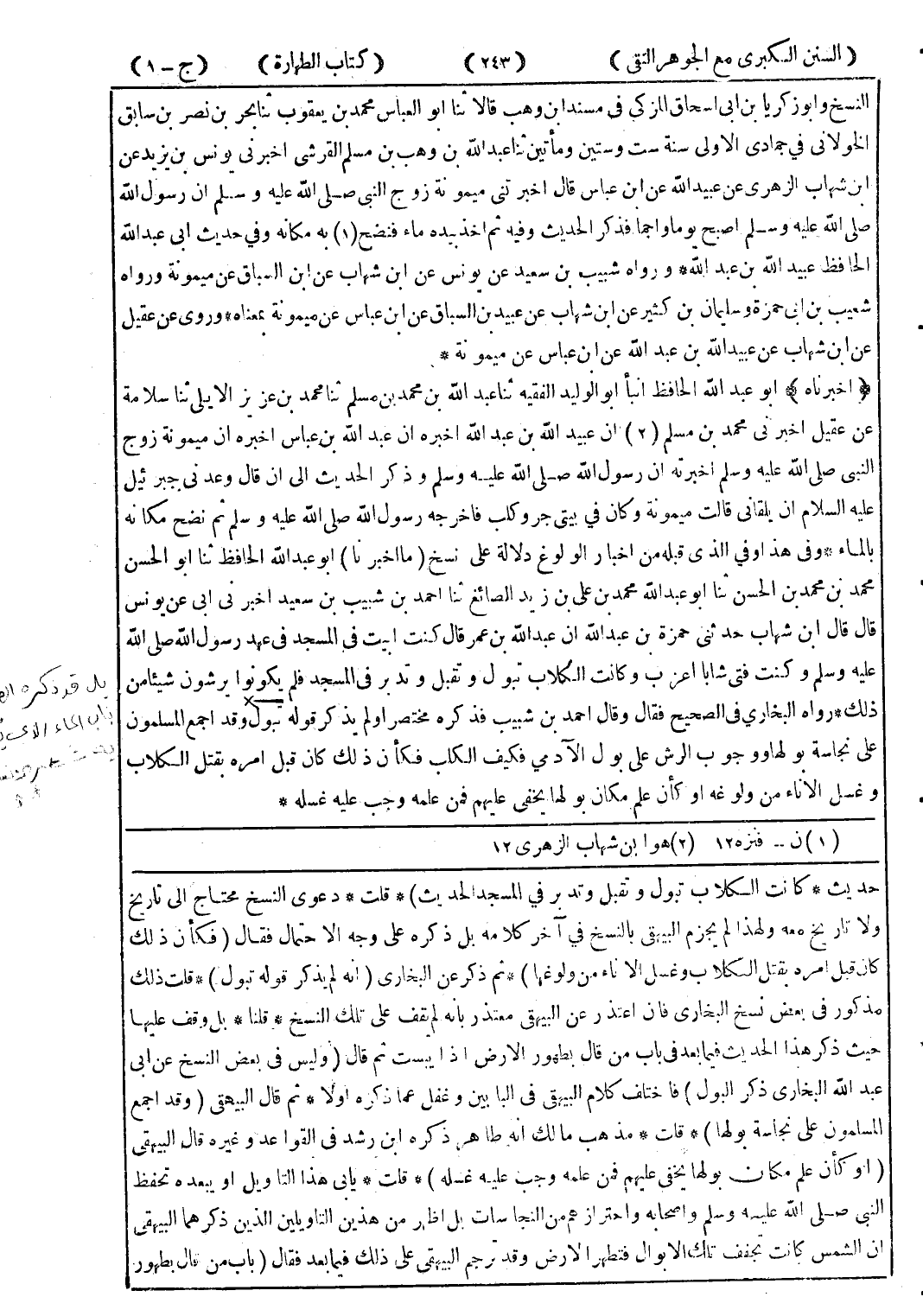 حديث * كانت الكلاب تبول وتدبر في المسجد الحديث) * قلت * دعوى النسخ محتاج إلى تاريخ ولا تاريخ معه لم يجزم البيهقى بالنسخ في آخر كلامه بل ذكره على وجه الاحتمال فقال (فكأن ذلك كان قبل امره بقتل الكلام وغسل الاناء من ولوغها) * ثم ذكر عن البخاري (انه لم يذكر قوله تبول) * قلت ذلك مذكور في بعض نسخ البخاري فان اعتذر عن البيهقى معتذر بانه لم يقف على تلك النسخ * قلنا * بل وقف عليها حيث ذكر هذا الحديث فيما بعد في باب من قال بطهور الارض إذ ايبست ثم قال (وليس في بعض النسخ عن ابى