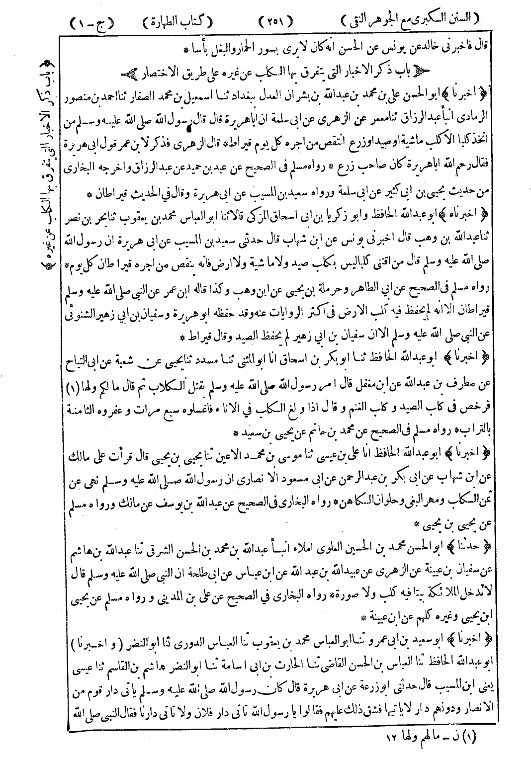 (أخبرناه) أبو عبد الله الحافظ وابو زكريا بن أبي اسحاق المزكي قالا ثنا أبو العباس محمد بن يعقوب ثنا بحر بن نصر ثنا عبد الله بن وهب قال أخبرني يونس عن ابن شهاب قال حدثني سعيد بن المسيب عن أبي هريرة ان رسول الله صلى الله عليه وسلم قال من اقتنى كلبا ليس بكلب صيد ولا ماشية ولا ارض فانه ينقص من أجره قيراطان كل يوم.